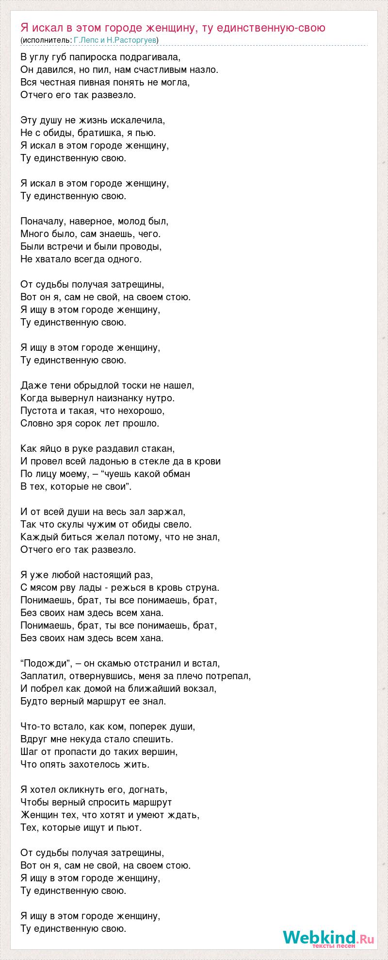 В углу губ папироска подрагивала, Он давился, но пил, нам счастливым назло. Вся честная пивная понять не могла, Отчего его так развезло. Эту душу не жизнь искалечила, Не с обиды, братишка, я пью. Я искал в этом городе женщину, Ту единственную свою. Я искал в этом городе женщину, Ту единственную свою. Поначалу, наверное, молод был, Много было, сам знаешь, чего. Были встречи и были проводы, Не хватало всегда одного. От судьбы получая затрещины, Вот он я, сам не свой, на своем стою. Я ищу в этом городе женщину, Ту единственную свою. Я ищу в этом городе женщину, Ту единственную свою. Даже тени обрыдлой тоски не нашел, Когда вывернул наизнанку нутро. Пустота и такая, что нехорошо, Словно зря сорок лет прошло. Как яйцо в руке раздавил стакан, И провел всей ладонью в стекле да в крови По лицу моему, – “чуешь какой обман В тех, которые не свои”. И от всей души на весь зал заржал, Так что скулы чужим от обиды свело. Каждый биться желал потому, что не знал, Отчего его так развезло. Я уже любой настоящий раз, С мясом рву лады - режься в кровь струна. Понимаешь, брат, ты все понимаешь, брат, Без своих нам здесь всем хана. Понимаешь, брат, ты все понимаешь, брат, Без своих нам здесь всем хана. “Подожди”, – он скамью отстранил и встал, Заплатил, отвернувшись, меня за плечо потрепал, И побрел как домой на ближайший вокзал, Будто верный маршрут ее знал. Что-то встало, как ком, поперек души, Вдруг мне некуда стало спешить. Шаг от пропасти до таких вершин, Что опять захотелось жить. Я хотел окликнуть его, догнать, Чтобы верный спросить маршрут Женщин тех, что хотят и умеют ждать, Тех, которые ищут и пьют. От судьбы получая затрещины, Вот он я, сам не свой, на своем стою. Я ищу в этом городе женщину, Ту единственную свою. Я ищу в этом городе женщину, Ту единственную свою.