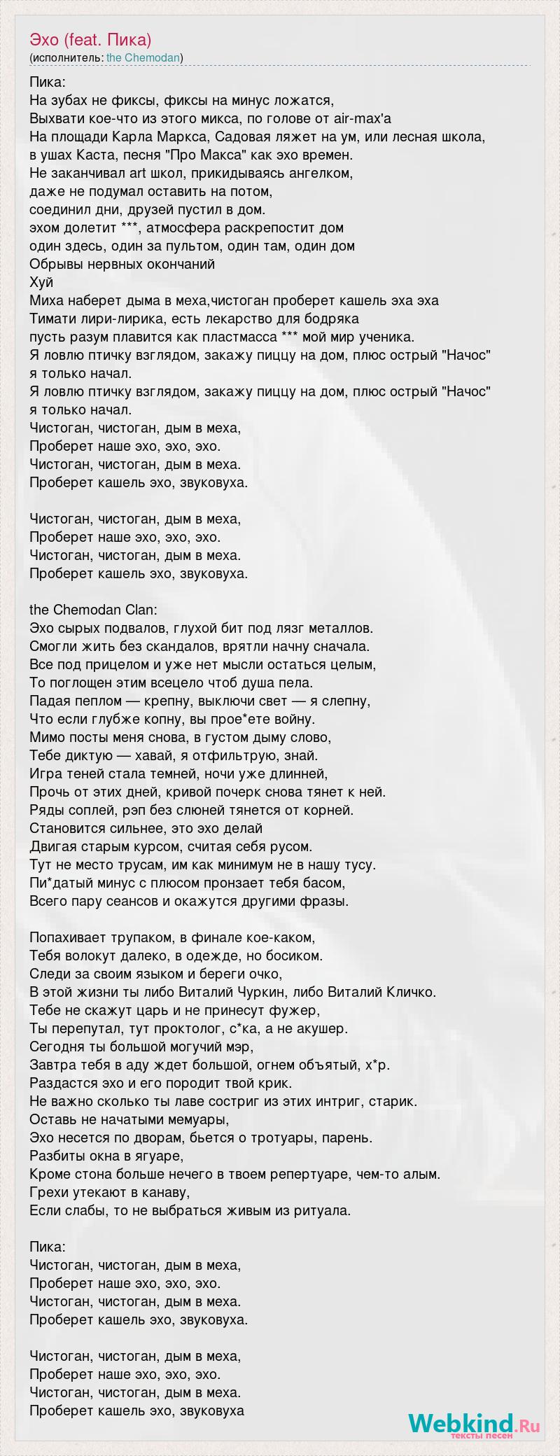 Пика: На зубах не фиксы, фиксы на минус ложатся, Выхвати кое-что из этого микса, по голове от air-max'а На площади Карла Маркса, Садовая ляжет на ум, или лесная школа, в ушах Каста, песня "Про Макса" как эхо времен. Не заканчивал art школ, прикидываясь ангелком, даже не подумал оставить на потом, соединил дни, друзей пустил в дом. эхом долетит ***, атмосфера раскрепостит дом один здесь, один за пультом, один там, один дом Обрывы нервных окончаний Хуй Миха наберет дыма в меха,чистоган проберет кашель эха эха Тимати лири-лирика, есть лекарство для бодряка пусть разум плавится как пластмасса *** мой мир ученика. Я ловлю птичку взглядом, закажу пиццу на дом, плюс острый "Начос" я только начал. Я ловлю птичку взглядом, закажу пиццу на дом, плюс острый "Начос" я только начал. Чистоган, чистоган, дым в меха, Проберет наше эхо, эхо, эхо. Чистоган, чистоган, дым в меха. Проберет кашель эхо, звуковуха. Чистоган, чистоган, дым в меха, Проберет наше эхо, эхо, эхо. Чистоган, чистоган, дым в меха. Проберет кашель эхо, звуковуха. the Chemodan Clan: Эхо сырых подвалов, глухой бит под лязг металлов. Смогли жить без скандалов, врятли начну сначала. Все под прицелом и уже нет мысли остаться целым, То поглощен этим всецело чтоб душа пела. Падая пеплом — крепну, выключи свет — я слепну, Что если глубже копну, вы прое*ете войну. Мимо посты меня снова, в густом дыму слово, Тебе диктую — хавай, я отфильтрую, знай. Игра теней стала темней, ночи уже длинней, Прочь от этих дней, кривой почерк снова тянет к ней. Ряды соплей, рэп без слюней тянется от корней. Становится сильнее, это эхо делай Двигая старым курсом, считая себя русом. Тут не место трусам, им как минимум не в нашу тусу. Пи*датый минус с плюсом пронзает тебя басом, Всего пару сеансов и окажутся другими фразы. Попахивает трупаком, в финале кое-каком, Тебя волокут далеко, в одежде, но босиком. Следи за своим языком и береги очко, В этой жизни ты либо Виталий Чуркин, либо Виталий Кличко. Тебе не скажут царь и не принесут фужер, Ты перепутал, тут проктолог, с*ка, а не акушер. Сегодня ты большой могучий мэр, Завтра тебя в аду ждет большой, огнем объятый, х*р. Раздастся эхо и его породит твой крик. Не важно сколько ты лаве состриг из этих интриг, старик. Оставь не начатыми мемуары, Эхо несется по дворам, бьется о тротуары, парень. Разбиты окна в ягуаре, Кроме стона больше нечего в твоем репертуаре, чем-то алым. Грехи утекают в канаву, Если слабы, то не выбраться живым из ритуала. Пика: Чистоган, чистоган, дым в меха, Проберет наше эхо, эхо, эхо. Чистоган, чистоган, дым в меха. Проберет кашель эхо, звуковуха. Чистоган, чистоган, дым в меха, Проберет наше эхо, эхо, эхо. Чистоган, чистоган, дым в меха. Проберет кашель эхо, звуковуха