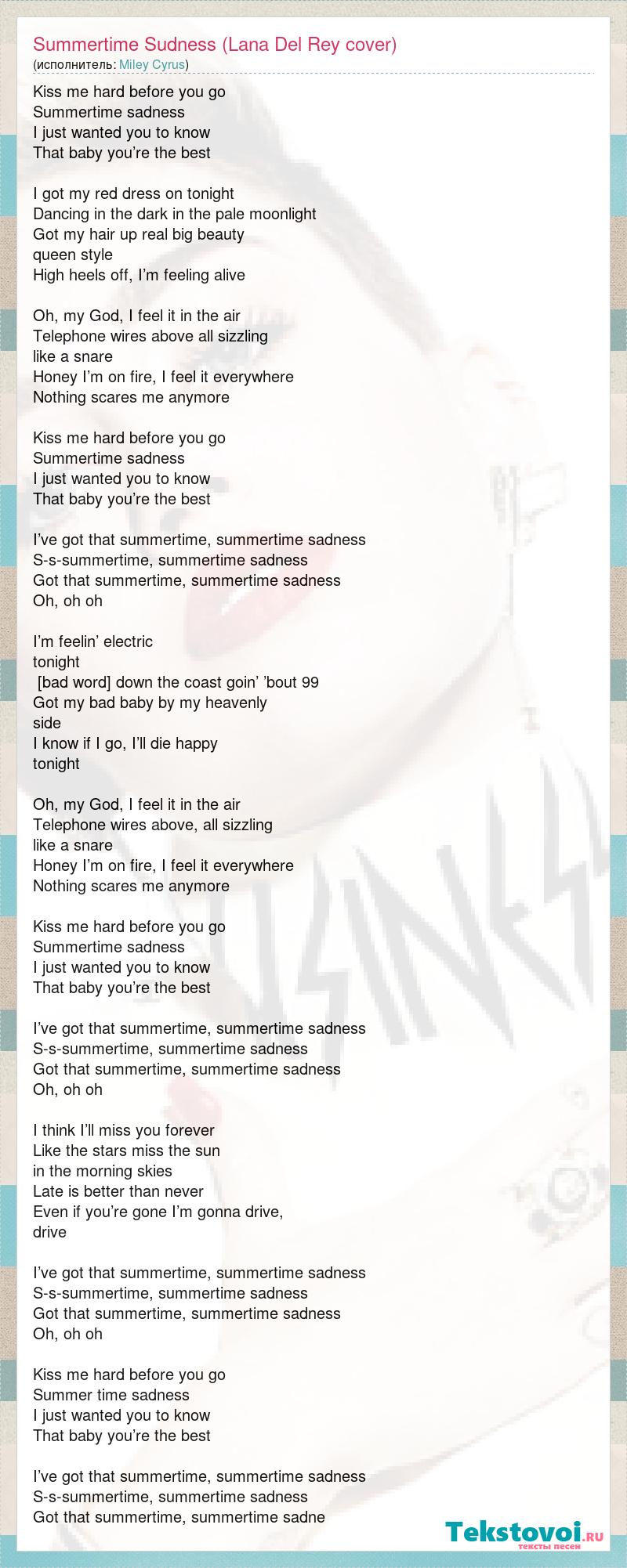 Kiss me hard before you go Summertime sadness I just wanted you to know That baby you’re the best I got my red dress on tonight Dancing in the dark in the pale moonlight Got my hair up real big beauty queen style High heels off, I’m feeling alive Oh, my God, I feel it in the air Telephone wires above all sizzling like a snare Honey I’m on fire, I feel it everywhere Nothing scares me anymore Kiss me hard before you go Summertime sadness I just wanted you to know That baby you’re the best I’ve got that summertime, summertime sadness S-s-summertime, summertime sadness Got that summertime, summertime sadness Oh, oh oh I’m feelin’ electric tonight [bad word] down the coast goin’ ’bout 99 Got my bad baby by my heavenly side I know if I go, I’ll die happy tonight Oh, my God, I feel it in the air Telephone wires above, all sizzling like a snare Honey I’m on fire, I feel it everywhere Nothing scares me anymore Kiss me hard before you go Summertime sadness I just wanted you to know That baby you’re the best I’ve got that summertime, summertime sadness S-s-summertime, summertime sadness Got that summertime, summertime sadness Oh, oh oh I think I’ll miss you forever Like the stars miss the sun in the morning skies Late is better than never Even if you’re gone I’m gonna drive, drive I’ve got that summertime, summertime sadness S-s-summertime, summertime sadness Got that summertime, summertime sadness Oh, oh oh Kiss me hard before you go Summer time sadness I just wanted you to know That baby you’re the best I’ve got that summertime, summertime sadness S-s-summertime, summertime sadness Got that summertime, summertime sadne