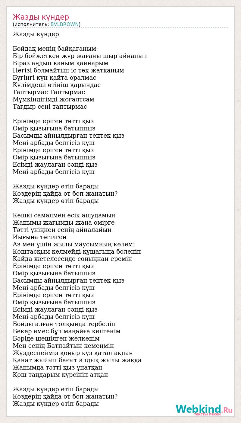 Жазды күндер Бойдақ менің байқағаным- Бір бойжеткен жүр жағаны шыр айналып Біраз аңдып қаным қайнарым Негізі болмайтын іс тек жатқаным Бүгінгі күн қайта оралмас Күлімдеші өтініш қарындас Таптырмас Таптырмас Мүмкіндігімді жоғалтсам Тағдыр сені таптырмас Ерінімде еріген тәтті қыз Өмір қызығына батыппыз Басымды айнылдырған тентек қыз Мені арбады белгісіз күш Ерінімде еріген тәтті қыз Өмір қызығына батыппыз Есімді жаулаған сәнді қыз Мені арбады белгісіз күш Жазды күндер өтіп барады Көздерің қайда от боп жанатын? Жазды күндер өтіп барады Кешкі самалмен есік ашудамын Жанымы жағымды жаңа өмірге Тәтті үніңнен сенің айналайын Иығыңа төгілген Аз мен үшін жылы маусымның көлемі Қоштасқым келмейді құщағыңа бөленіп Қайда жетелесеңде соңыңнан еремін Ерінімде еріген тәтті қыз Өмір қызығына батыппыз Басымды айнылдырған тентек қыз Мені арбады белгісіз күш Ерінімде еріген тәтті қыз Өмір қызығына батыппыз Есімді жаулаған сәнді қыз Мені арбады белгісіз күш Бойды алған толқында тербеліп Бекер емес бұл маңайға келгенім Бәріде шешілген желкенім Мен сенің Батпайтын кемеңмін Жүздеспейміз қоңыр күз қатал ақпан Қанат жыйып бағыт алдық жылы жаққа Жанымда тәтті қыз ұнатқан Қош таңдарым күрсініп атқан Жазды күндер өтіп барады Көздерің қайда от боп жанатын? Жазды күндер өтіп барады