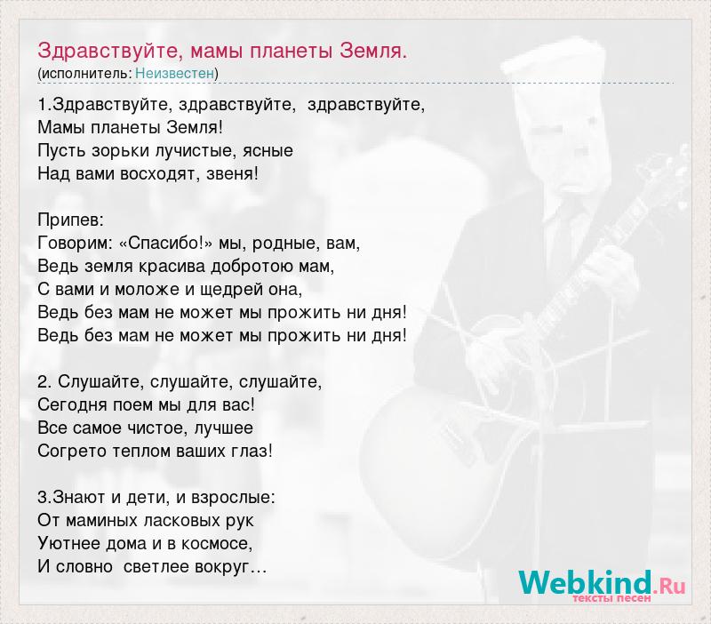 1.Здравствуйте, здравствуйте, здравствуйте, Мамы планеты Земля! Пусть зорьки лучистые, ясные Над вами восходят, звеня! Припев: Говорим: «Спасибо!» мы, родные, вам, Ведь земля красива добротою мам, С вами и моложе и щедрей она, Ведь без мам не может мы прожить ни дня! Ведь без мам не может мы прожить ни дня! 2. Слушайте, слушайте, слушайте, Сегодня поем мы для вас! Все самое чистое, лучшее Согрето теплом ваших глаз! 3.Знают и дети, и взрослые: От маминых ласковых рук Уютнее дома и в космосе, И словно светлее вокруг…
