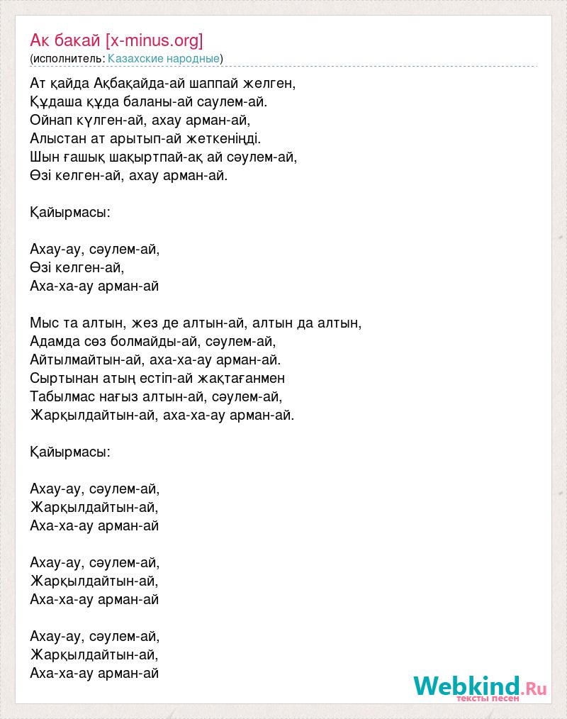 Ат қайда Ақбақайда-ай шаппай желген, Құдаша құда баланы-ай саулем-ай. Ойнап күлген-ай, ахау арман-ай, Алыстан ат арытып-ай жеткеніңді. Шын ғашық шақыртпай-ақ ай сәулем-ай, Өзі келген-ай, ахау арман-ай. Қайырмасы: Ахау-ау, сәулем-ай, Өзі келген-ай, Аха-ха-ау арман-ай Мыс та алтын, жез де алтын-ай, алтын да алтын, Адамда сөз болмайды-ай, сәулем-ай, Айтылмайтын-ай, аха-ха-ау арман-ай. Сыртынан атың естіп-ай жақтағанмен Табылмас нағыз алтын-ай, сәулем-ай, Жарқылдайтын-ай, аха-ха-ау арман-ай. Қайырмасы: Ахау-ау, сәулем-ай, Жарқылдайтын-ай, Аха-ха-ау арман-ай Ахау-ау, сәулем-ай, Жарқылдайтын-ай, Аха-ха-ау арман-ай Ахау-ау, сәулем-ай, Жарқылдайтын-ай, Аха-ха-ау арман-ай