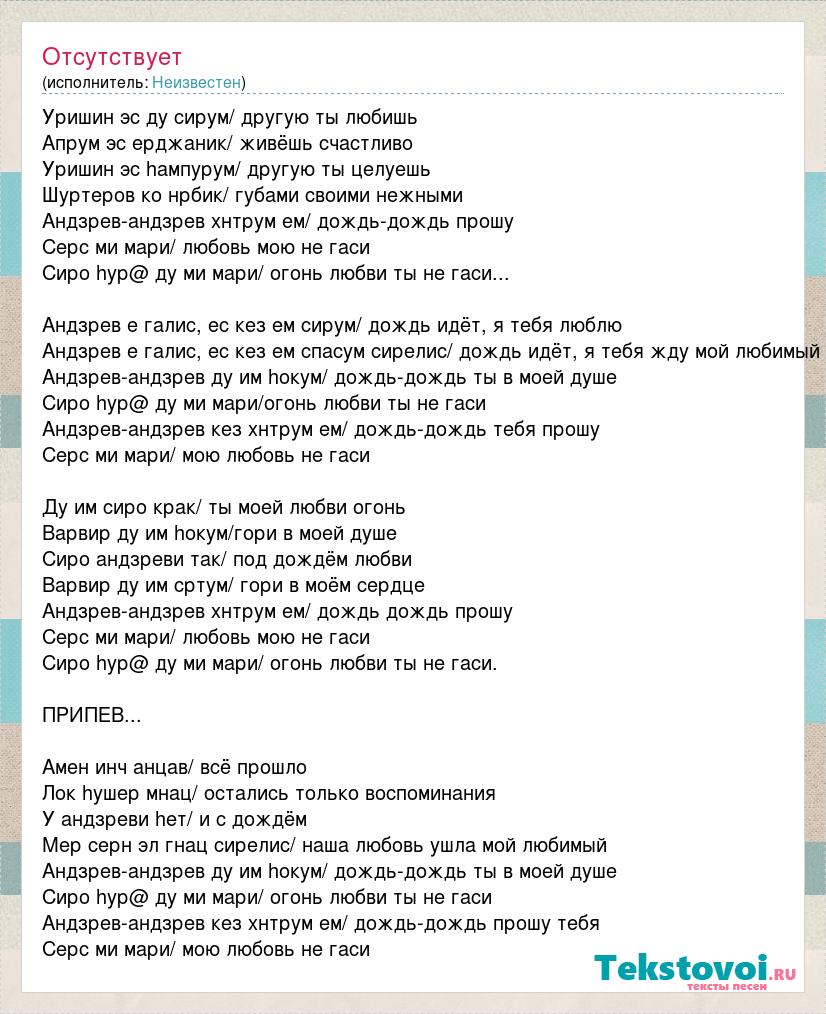Уришин эс ду сирум/ другую ты любишь Апрум эс ерджаник/ живёшь счастливо Уришин эс hампурум/ другую ты целуешь Шуртеров ко нрбик/ губами своими нежными Андзрев-андзрев хнтрум ем/ дождь-дождь прошу Серс ми мари/ любовь мою не гаси Сиро hур@ ду ми мари/ огонь любви ты не гаси... Андзрев е галис, ес кез ем сирум/ дождь идёт, я тебя люблю Андзрев е галис, ес кез ем спасум сирелис/ дождь идёт, я тебя жду мой любимый Андзрев-андзрев ду им hокум/ дождь-дождь ты в моей душе Сиро hур@ ду ми мари/огонь любви ты не гаси Андзрев-андзрев кез хнтрум ем/ дождь-дождь тебя прошу Серс ми мари/ мою любовь не гаси Ду им сиро крак/ ты моей любви огонь Варвир ду им hокум/гори в моей душе Сиро андзреви так/ под дождём любви Варвир ду им сртум/ гори в моём сердце Андзрев-андзрев хнтрум ем/ дождь дождь прошу Серс ми мари/ любовь мою не гаси Сиро hур@ ду ми мари/ огонь любви ты не гаси. ПРИПЕВ... Амен инч анцав/ всё прошло Лок hушер мнац/ остались только воспоминания У андзреви hет/ и с дождём Мер серн эл гнац сирелис/ наша любовь ушла мой любимый Андзрев-андзрев ду им hокум/ дождь-дождь ты в моей душе Сиро hур@ ду ми мари/ огонь любви ты не гаси Андзрев-андзрев кез хнтрум ем/ дождь-дождь прошу тебя Серс ми мари/ мою любовь не гаси