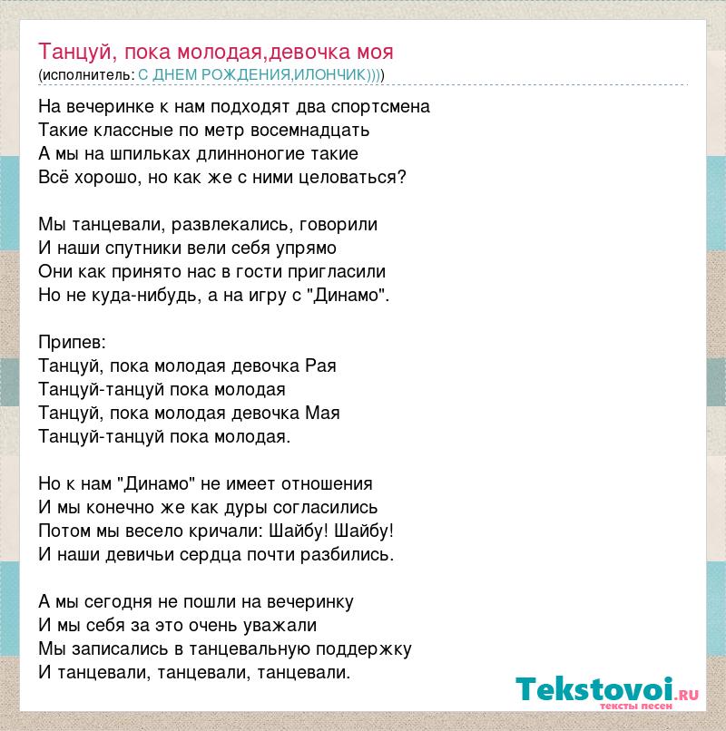 На вечеринке к нам подходят два спортсмена Такие классные по метр восемнадцать А мы на шпильках длинноногие такие Всё хорошо, но как же с ними целоваться? Мы танцевали, развлекались, говорили И наши спутники вели себя упрямо Они как принято нас в гости пригласили Но не куда-нибудь, а на игру с "Динамо". Припев: Танцуй, пока молодая девочка Рая Танцуй-танцуй пока молодая Танцуй, пока молодая девочка Мая Танцуй-танцуй пока молодая. Но к нам "Динамо" не имеет отношения И мы конечно же как дуры согласились Потом мы весело кричали: Шайбу! Шайбу! И наши девичьи сердца почти разбились. А мы сегодня не пошли на вечеринку И мы себя за это очень уважали Мы записались в танцевальную поддержку И танцевали, танцевали, танцевали.