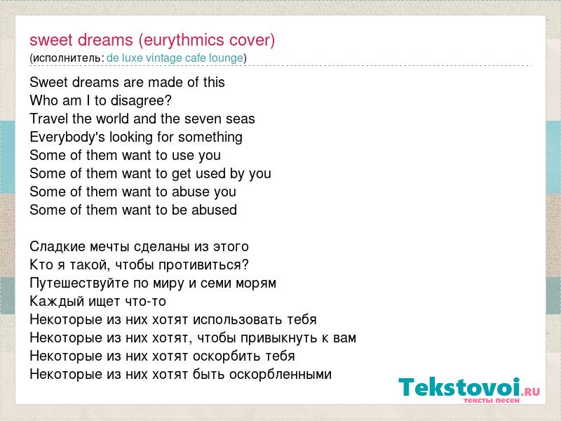 Sweet dreams are made of this Who am I to disagree? Travel the world and the seven seas Everybody's looking for something Some of them want to use you Some of them want to get used by you Some of them want to abuse you Some of them want to be abused Сладкие мечты сделаны из этого Кто я такой, чтобы противиться? Путешествуйте по миру и семи морям Каждый ищет что-то Некоторые из них хотят использовать тебя Некоторые из них хотят, чтобы привыкнуть к вам Некоторые из них хотят оскорбить тебя Некоторые из них хотят быть оскорбленными