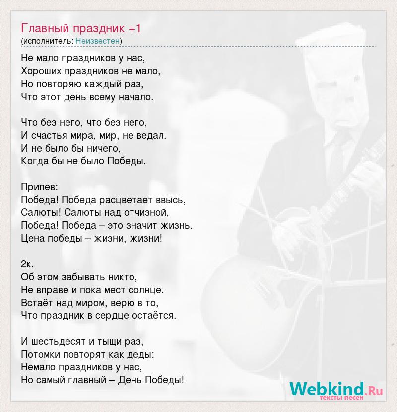 Не мало праздников у нас, Хороших праздников не мало, Но повторяю каждый раз, Что этот день всему начало. Что без него, что без него, И счастья мира, мир, не ведал. И не было бы ничего, Когда бы не было Победы. Припев: Победа! Победа расцветает ввысь, Салюты! Салюты над отчизной, Победа! Победа – это значит жизнь. Цена победы – жизни, жизни! 2к. Об этом забывать никто, Не вправе и пока мест солнце. Встаёт над миром, верю в то, Что праздник в сердце остаётся. И шестьдесят и тыщи раз, Потомки повторят как деды: Немало праздников у нас, Но самый главный – День Победы!