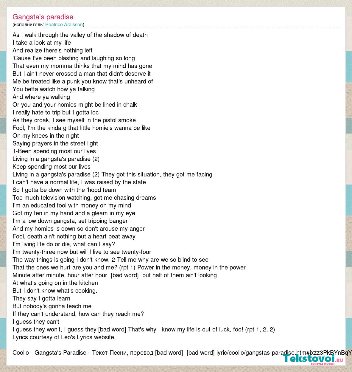 As I walk through the valley of the shadow of death I take a look at my life And realize there's nothing left 'Cause I've been blasting and laughing so long That even my momma thinks that my mind has gone But I ain't never crossed a man that didn't deserve it Me be treated like a punk you know that's unheard of You betta watch how ya talking And where ya walking Or you and your homies might be lined in chalk I really hate to trip but I gotta loc As they croak, I see myself in the pistol smoke Fool, I'm the kinda g that little homie's wanna be like On my knees in the night Saying prayers in the street light 1-Been spending most our lives Living in a gangsta's paradise (2) Keep spending most our lives Living in a gangsta's paradise (2) They got this situation, they got me facing I can't have a normal life, I was raised by the state So I gotta be down with the 'hood team Too much television watching, got me chasing dreams I'm an educated fool with money on my mind Got my ten in my hand and a gleam in my eye I'm a low down gangsta, set tripping banger And my homies is down so don't arouse my anger Fool, death ain't nothing but a heart beat away I'm living life do or die, what can I say? I'm twenty-three now but will I live to see twenty-four The way things is going I don't know. 2-Tell me why are we so blind to see That the ones we hurt are you and me? (rpt 1) Power in the money, money in the power Minute after minute, hour after hour Everybody's running, but half of them ain't looking At what's going on in the kitchen But I don't know what's cooking. They say I gotta learn But nobody's gonna teach me If they can't understand, how can they reach me? I guess they can't I guess they won't, I guess they [bad word] That's why I know my life is out of luck, foo! (rpt 1, 2, 2) Lyrics courtesy of Leo's Lyrics website. Coolio - Gangsta's Paradise - Текст Песни, перевод [bad word] [bad word] lyric/coolio/gangstas-paradise.htm#ixzz3PkBYnBqY