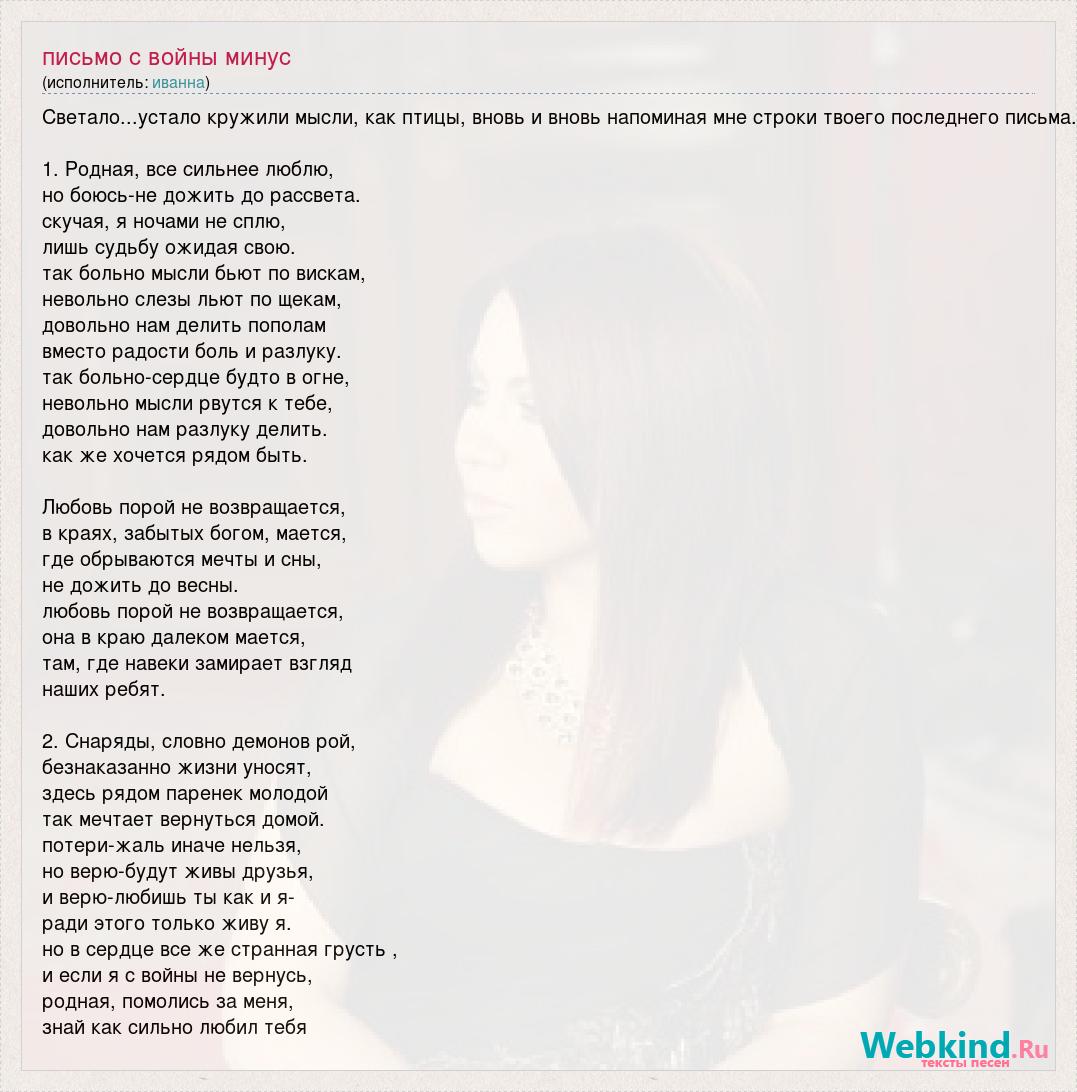Светало...устало кружили мысли, как птицы, вновь и вновь напоминая мне строки твоего последнего письма. 1. Родная, все сильнее люблю, но боюсь-не дожить до рассвета. скучая, я ночами не сплю, лишь судьбу ожидая свою. так больно мысли бьют по вискам, невольно слезы льют по щекам, довольно нам делить пополам вместо радости боль и разлуку. так больно-сердце будто в огне, невольно мысли рвутся к тебе, довольно нам разлуку делить. как же хочется рядом быть. Любовь порой не возвращается, в краях, забытых богом, мается, где обрываются мечты и сны, не дожить до весны. любовь порой не возвращается, она в краю далеком мается, там, где навеки замирает взгляд наших ребят. 2. Снаряды, словно демонов рой, безнаказанно жизни уносят, здесь рядом паренек молодой так мечтает вернуться домой. потери-жаль иначе нельзя, но верю-будут живы друзья, и верю-любишь ты как и я- ради этого только живу я. но в сердце все же странная грусть , и если я с войны не вернусь, родная, помолись за меня, знай как сильно любил тебя