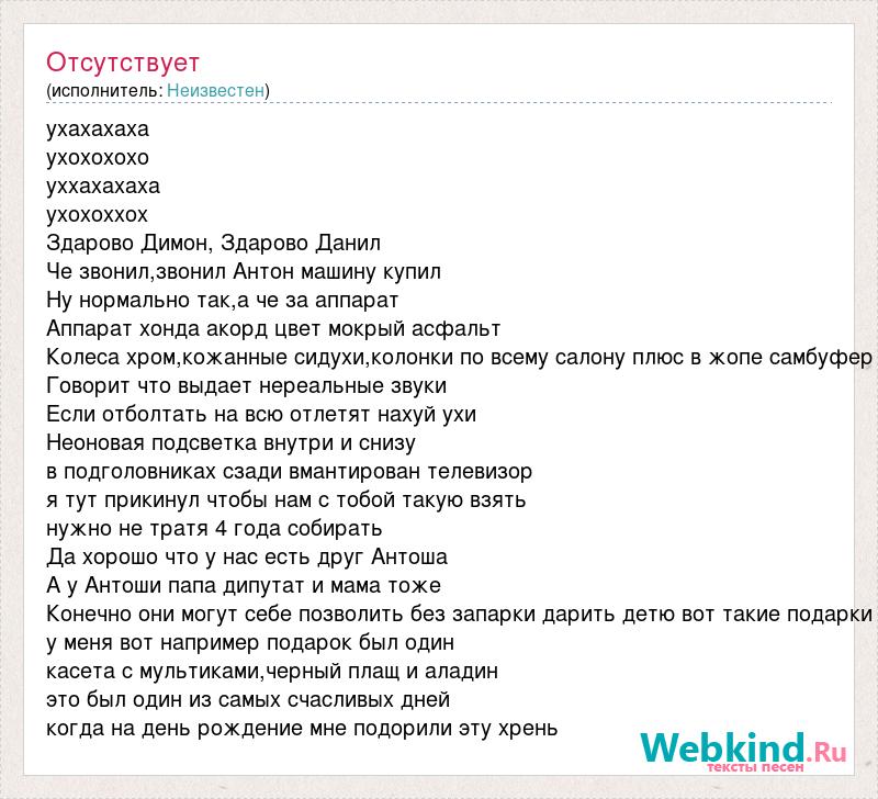 ухахахаха ухохохохо уххахахаха ухохоххох Здарово Димон, Здарово Данил Че звонил,звонил Антон машину купил Ну нормально так,а че за аппарат Аппарат хонда акорд цвет мокрый асфальт Колеса хром,кожанные сидухи,колонки по всему салону плюс в жопе самбуфер Говорит что выдает нереальные звуки Если отболтать на всю отлетят нахуй ухи Неоновая подсветка внутри и снизу в подголовниках сзади вмантирован телевизор я тут прикинул чтобы нам с тобой такую взять нужно не тратя 4 года собирать Да хорошо что у нас есть друг Антоша А у Антоши папа дипутат и мама тоже Конечно они могут себе позволить без запарки дарить детю вот такие подарки у меня вот например подарок был один касета с мультиками,черный плащ и аладин это был один из самых счасливых дней когда на день рождение мне подорили эту хрень