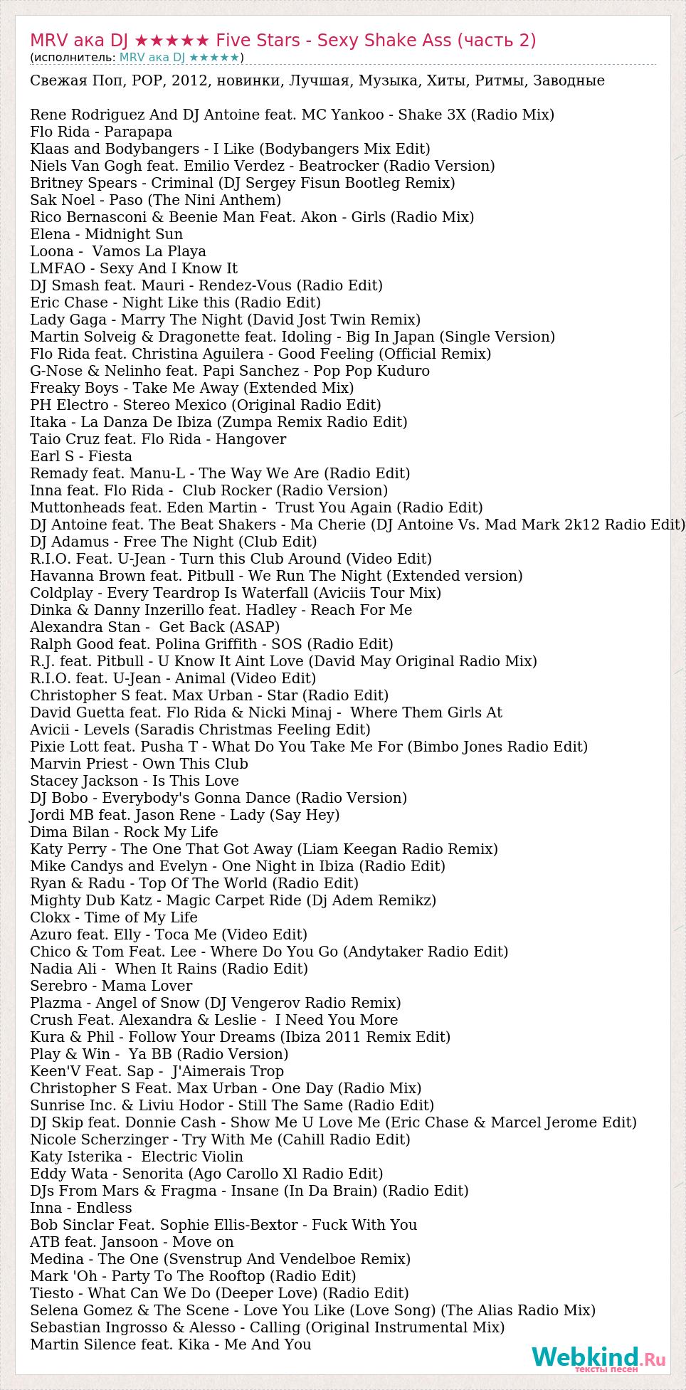 Свежая Поп, POP, 2012, новинки, Лучшая, Музыка, Хиты, Ритмы, Заводные Rene Rodriguez And DJ Antoine feat. MC Yankoo - Shake 3X (Radio Mix) Flo Rida - Parapapa Klaas and Bodybangers - I Like (Bodybangers Mix Edit) Niels Van Gogh feat. Emilio Verdez - Beatrocker (Radio Version) Britney Spears - Criminal (DJ Sergey Fisun Bootleg Remix) Sak Noel - Paso (The Nini Anthem) Rico Bernasconi & Beenie Man Feat. Akon - Girls (Radio Mix) Elena - Midnight Sun Loona - Vamos La Playa LMFAO - Sexy And I Know It DJ Smash feat. Mauri - Rendez-Vous (Radio Edit) Eric Chase - Night Like this (Radio Edit) Lady Gaga - Marry The Night (David Jost Twin Remix) Martin Solveig & Dragonette feat. Idoling - Big In Japan (Single Version) Flo Rida feat. Christina Aguilera - Good Feeling (Official Remix) G-Nose & Nelinho feat. Papi Sanchez - Pop Pop Kuduro Freaky Boys - Take Me Away (Extended Mix) PH Electro - Stereo Mexico (Original Radio Edit) Itaka - La Danza De Ibiza (Zumpa Remix Radio Edit) Taio Cruz feat. Flo Rida - Hangover Earl S - Fiesta Remady feat. Manu-L - The Way We Are (Radio Edit) Inna feat. Flo Rida - Club Rocker (Radio Version) Muttonheads feat. Eden Martin - Trust You Again (Radio Edit) DJ Antoine feat. The Beat Shakers - Ma Cherie (DJ Antoine Vs. Mad Mark 2k12 Radio Edit) DJ Adamus - Free The Night (Club Edit) R.I.O. Feat. U-Jean - Turn this Club Around (Video Edit) Havanna Brown feat. Pitbull - We Run The Night (Extended version) Coldplay - Every Teardrop Is Waterfall (Aviciis Tour Mix) Dinka & Danny Inzerillo feat. Hadley - Reach For Me Alexandra Stan - Get Back (ASAP) Ralph Good feat. Polina Griffith - SOS (Radio Edit) R.J. feat. Pitbull - U Know It Aint Love (David May Original Radio Mix) R.I.O. feat. U-Jean - Animal (Video Edit) Christopher S feat. Max Urban - Star (Radio Edit) David Guetta feat. Flo Rida & Nicki Minaj - Where Them Girls At Avicii - Levels (Saradis Christmas Feeling Edit) Pixie Lott feat. Pusha T - What Do You Take Me For (Bimbo Jones Radio Edit) Marvin Priest - Own This Club Stacey Jackson - Is This Love DJ Bobo - Everybody's Gonna Dance (Radio Version) Jordi MB feat. Jason Rene - Lady (Say Hey) Dima Bilan - Rock My Life Katy Perry - The One That Got Away (Liam Keegan Radio Remix) Mike Candys and Evelyn - One Night in Ibiza (Radio Edit) Ryan & Radu - Top Of The World (Radio Edit) Mighty Dub Katz - Magic Carpet Ride (Dj Adem Remikz) Clokx - Time of My Life Azuro feat. Elly - Toca Me (Video Edit) Chico & Tom Feat. Lee - Where Do You Go (Andytaker Radio Edit) Nadia Ali - When It Rains (Radio Edit) Serebro - Mama Lover Plazma - Angel of Snow (DJ Vengerov Radio Remix) Crush Feat. Alexandra & Leslie - I Need You More Kura & Phil - Follow Your Dreams (Ibiza 2011 Remix Edit) Play & Win - Ya BB (Radio Version) Keen'V Feat. Sap - J'Aimerais Trop Christopher S Feat. Max Urban - One Day (Radio Mix) Sunrise Inc. & Liviu Hodor - Still The Same (Radio Edit) DJ Skip feat. Donnie Cash - Show Me U Love Me (Eric Chase & Marcel Jerome Edit) Nicole Scherzinger - Try With Me (Cahill Radio Edit) Katy Isterika - Electric Violin Eddy Wata - Senorita (Ago Carollo Xl Radio Edit) DJs From Mars & Fragma - Insane (In Da Brain) (Radio Edit) Inna - Endless Bob Sinclar Feat. Sophie Ellis-Bextor - Fuck With You ATB feat. Jansoon - Move on Medina - The One (Svenstrup And Vendelboe Remix) Mark 'Oh - Party To The Rooftop (Radio Edit) Tiesto - What Can We Do (Deeper Love) (Radio Edit) Selena Gomez & The Scene - Love You Like (Love Song) (The Alias Radio Mix) Sebastian Ingrosso & Alesso - Calling (Original Instrumental Mix) Martin Silence feat. Kika - Me And You