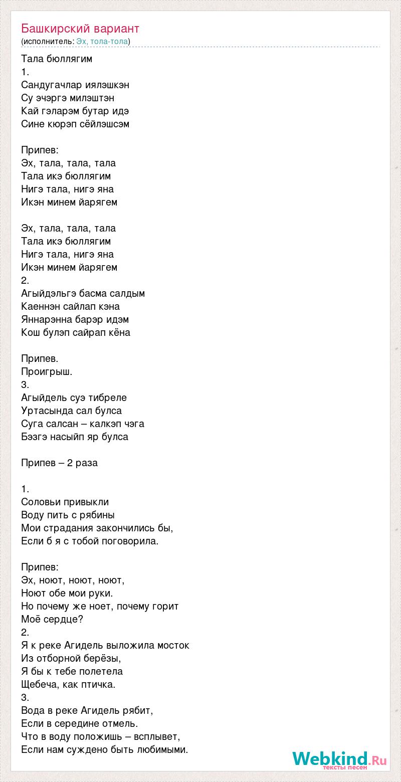 Тала бюллягим 1. Сандугачлар иялэшкэн Су эчэргэ милэштэн Кай гэларэм бутар идэ Сине кюрэп сёйлэшсэм Припев: Эх, тала, тала, тала Тала икэ бюллягим Нигэ тала, нигэ яна Икэн минем йарягем Эх, тала, тала, тала Тала икэ бюллягим Нигэ тала, нигэ яна Икэн минем йарягем 2. Агыйдэльгэ басма салдым Каеннэн сайлап кэна Яннарэнна барэр идэм Кош булэп сайрап кёна Припев. Проигрыш. 3. Агыйдель суэ тибреле Уртасында сал булса Суга салсан – калкэп чэга Бэзгэ насыйп яр булса Припев – 2 раза 1. Соловьи привыкли Воду пить с рябины Мои страдания закончились бы, Если б я с тобой поговорила. Припев: Эх, ноют, ноют, ноют, Ноют обе мои руки. Но почему же ноет, почему горит Моё сердце? 2. Я к реке Агидель выложила мосток Из отборной берёзы, Я бы к тебе полетела Щебеча, как птичка. 3. Вода в реке Агидель рябит, Если в середине отмель. Что в воду положишь – всплывет, Если нам суждено быть любимыми.