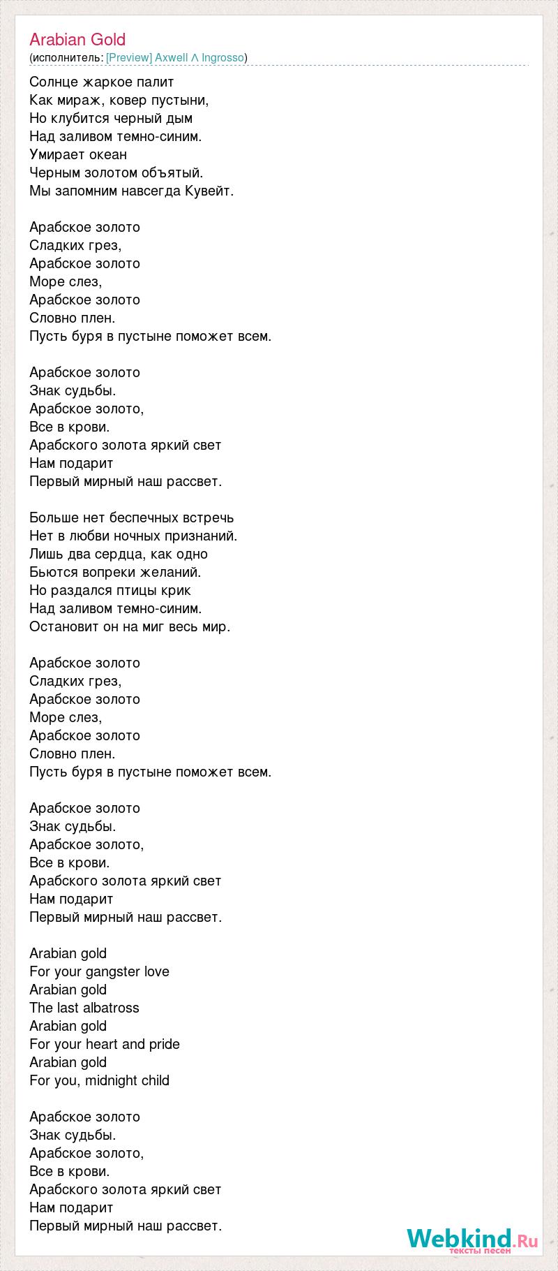 Солнце жаркое палит Как мираж, ковер пустыни, Но клубится черный дым Над заливом темно-синим. Умирает океан Черным золотом объятый. Мы запомним навсегда Кувейт. Арабское золото Сладких грез, Арабское золото Море слез, Арабское золото Словно плен. Пусть буря в пустыне поможет всем. Арабское золото Знак судьбы. Арабское золото, Все в крови. Арабского золота яркий свет Нам подарит Первый мирный наш рассвет. Больше нет беспечных встречь Нет в любви ночных признаний. Лишь два сердца, как одно Бьются вопреки желаний. Но раздался птицы крик Над заливом темно-синим. Остановит он на миг весь мир. Арабское золото Сладких грез, Арабское золото Море слез, Арабское золото Словно плен. Пусть буря в пустыне поможет всем. Арабское золото Знак судьбы. Арабское золото, Все в крови. Арабского золота яркий свет Нам подарит Первый мирный наш рассвет. Arabian gold For your gangster love Arabian gold The last albatross Arabian gold For your heart and pride Arabian gold For you, midnight child Арабское золото Знак судьбы. Арабское золото, Все в крови. Арабского золота яркий свет Нам подарит Первый мирный наш рассвет.