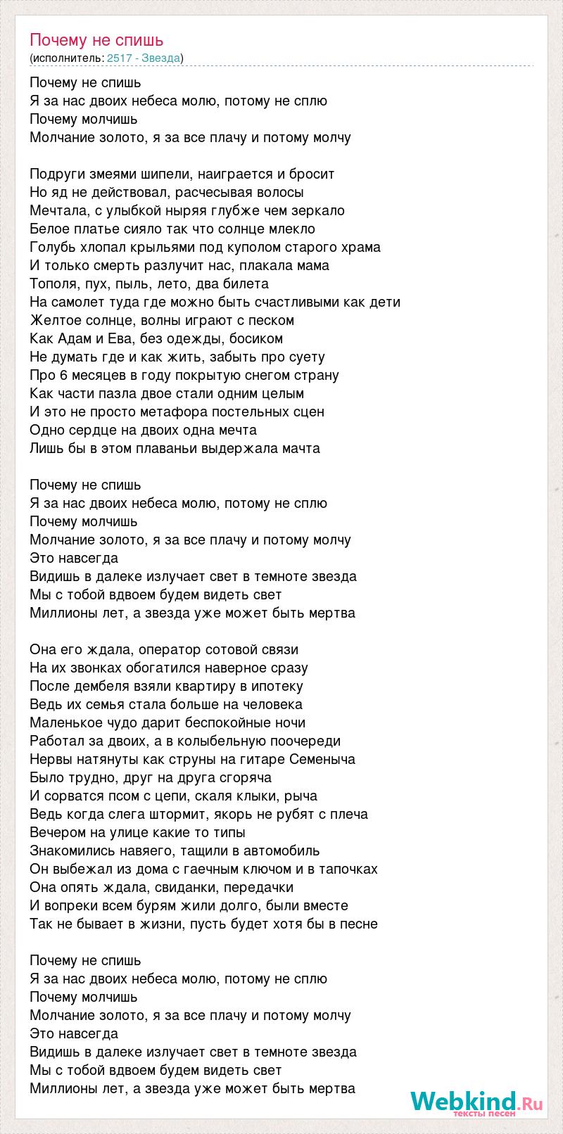 Почему не спишь Я за нас двоих небеса молю, потому не сплю Почему молчишь Молчание золото, я за все плачу и потому молчу Подруги змеями шипели, наиграется и бросит Но яд не действовал, расчесывая волосы Мечтала, с улыбкой ныряя глубже чем зеркало Белое платье сияло так что солнце млекло Голубь хлопал крыльями под куполом старого храма И только смерть разлучит нас, плакала мама Тополя, пух, пыль, лето, два билета На самолет туда где можно быть счастливыми как дети Желтое солнце, волны играют с песком Как Адам и Ева, без одежды, босиком Не думать где и как жить, забыть про суету Про 6 месяцев в году покрытую снегом страну Как части пазла двое стали одним целым И это не просто метафора постельных сцен Одно сердце на двоих одна мечта Лишь бы в этом плаваньи выдержала мачта Почему не спишь Я за нас двоих небеса молю, потому не сплю Почему молчишь Молчание золото, я за все плачу и потому молчу Это навсегда Видишь в далеке излучает свет в темноте звезда Мы с тобой вдвоем будем видеть свет Миллионы лет, а звезда уже может быть мертва Она его ждала, оператор сотовой связи На их звонках обогатился наверное сразу После дембеля взяли квартиру в ипотеку Ведь их семья стала больше на человека Маленькое чудо дарит беспокойные ночи Работал за двоих, а в колыбельную поочереди Нервы натянуты как струны на гитаре Семеныча Было трудно, друг на друга сгоряча И сорватся псом с цепи, скаля клыки, рыча Ведь когда слега штормит, якорь не рубят с плеча Вечером на улице какие то типы Знакомились навяего, тащили в автомобиль Он выбежал из дома с гаечным ключом и в тапочках Она опять ждала, свиданки, передачки И вопреки всем бурям жили долго, были вместе Так не бывает в жизни, пусть будет хотя бы в песне Почему не спишь Я за нас двоих небеса молю, потому не сплю Почему молчишь Молчание золото, я за все плачу и потому молчу Это навсегда Видишь в далеке излучает свет в темноте звезда Мы с тобой вдвоем будем видеть свет Миллионы лет, а звезда уже может быть мертва