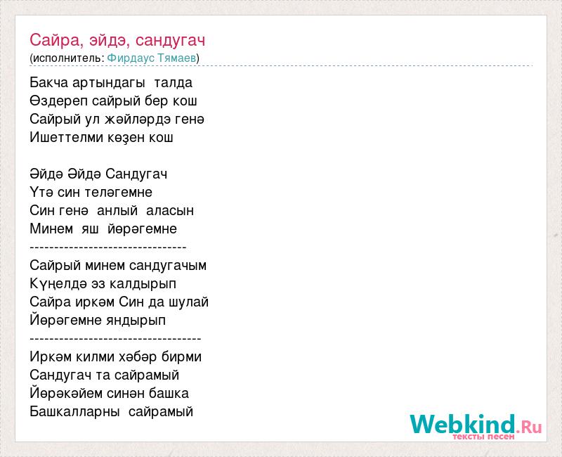 Бакча артындагы талда Өздереп сайрый бер кош Сайрый ул жәйләрдэ генә Ишеттелми көҙен кош Әйдә Әйдә Сандугач Үтә син теләгемне Син генә анлый аласын Минем яш йөрәгемне -------------------------------- Сайрый минем сандугачым Күңелдә эз калдырып Сайра иркәм Син да шулай Йөрәгемне яндырып ----------------------------------- Иркәм килми хәбәр бирми Сандугач та сайрамый Йөрәкәйем синән башка Башкалларны сайрамый