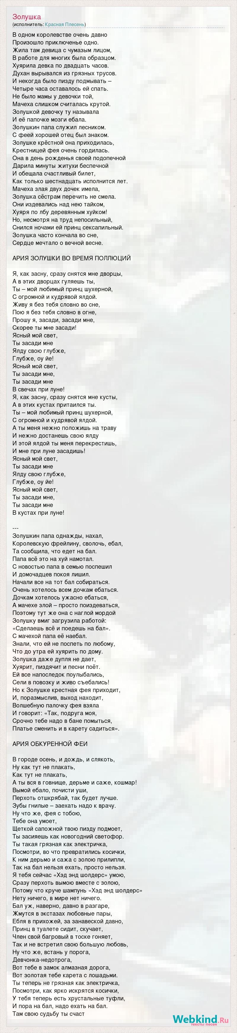 В одном королевстве очень давно Произошло приключенье одно. Жила там девица с чумазым лицом, В работе для многих была образцом. Хуярила девка по двадцать часов. Духан вырывался из грязных трусов. И некогда было пизду подмывать – Четыре часа оставалось ей спать. Не было мамы у девочки той, Мачеха слишком считалась крутой. Золушкой девочку ту называла И её папочке мозги ебала. Золушкин папа служил лесником. С феей хорошей отец был знаком. Золушке крёстной она приходилась, Крестницей фея очень гордилась. Она в день рожденья своей подопечной Дарила минуты житухи беспечной И обещала счастливый билет, Как только шестнадцать исполнится лет. Мачеха злая двух дочек имела, Золушка сёстрам перечить не смела. Они издевались над нею тайком, Хуяря по лбу деревянным хуйком! Но, несмотря на труд непосильный, Снился ночами ей принц сексапильный. Золушка часто кончала во сне, Сердце мечтало о вечной весне. АРИЯ ЗОЛУШКИ ВО ВРЕМЯ ПОЛЛЮЦИЙ Я, как засну, сразу снятся мне дворцы, А в этих дворцах гуляешь ты, Ты – мой любимый принц шухерной, С огромной и кудрявой ялдой. Живу я без тебя словно во сне, Пою я без тебя словно в огне, Прошу я, засади, засади мне, Скорее ты мне засади! Ясный мой свет, Ты засади мне Ялду свою глубже, Глубже, оу йе! Ясный мой свет, Ты засади мне, Ты засади мне В свечах при луне! Я, как засну, сразу снятся мне кусты, А в этих кустах притаился ты. Ты – мой любимый принц шухерной, С огромной и кудрявой ялдой. А ты меня нежно положишь на траву И нежно достанешь свою ялду И этой ялдой ты меня перекрестишь, И мне при луне засадишь! Ясный мой свет, Ты засади мне Ялду свою глубже, Глубже, оу йе! Ясный мой свет, Ты засади мне, Ты засади мне В кустах при луне! --- Золушкин папа однажды, нахал, Королевскую фрейлину, сволочь, ебал, Та сообщила, что едет на бал. Папа всё это на хуй намотал. С новостью папа в семью поспешил И домочадцев покоя лишил. Начали все на тот бал собираться. Очень хотелось всем дочкам ебаться. Дочкам хотелось ужасно ебаться, А мачехе злой – просто поиздеваться, Поэтому тут же она с наглой мордой Золушку вмиг загрузила работой: «Сделаешь всё и поедешь на бал». С мачехой папа её наебал. Знали, что ей не поспеть по любому, Что до утра ей хуярить по дому. Золушка даже дупля не дает, Хуярит, пиздячит и песни поёт. Ей все напоследок поулыбались, Сели в повозку и живо съебались! Но к Золушке крестная фея приходит, И, поразмыслив, выход находит, Волшебную палочку фея взяла И говорит: «Так, подруга моя, Срочно тебе надо в бане помыться, Платье сменить и в карету садиться». АРИЯ ОБКУРЕННОЙ ФЕИ В городе осень, и дождь, и слякоть, Ну как тут не плакать, Как тут не плакать, А ты вся в говнище, дерьме и саже, кошмар! Вымой ебало, почисти уши, Перхоть отшкрябай, так будет лучше. Зубы гнилые – заехать надо к врачу. Ну что же, фея с тобою, Тебе она умоет, Щеткой сапожной твою пизду подмоет, Ты засияешь как новогодний светофор. Ты такая грязная как электричка, Посмотри, во что превратились косички, К ним дерьмо и сажа с золою прилипли, Так на бал нельзя ехать, просто нельзя. Я тебя сейчас «Хэд энд шолдерс» умою, Сразу перхоть вымою вместе с золою, Потому что круче шампунь «Хэд энд шолдерс» Нету ничего, в мире нет ничего. Бал уж, наверно, давно в разгаре, Жмутся в экстазах любовные пары, Ебля в прихожей, за занавеской давно, Принц в туалете сидит, скучает, Член свой багровый в тоске гоняет, 