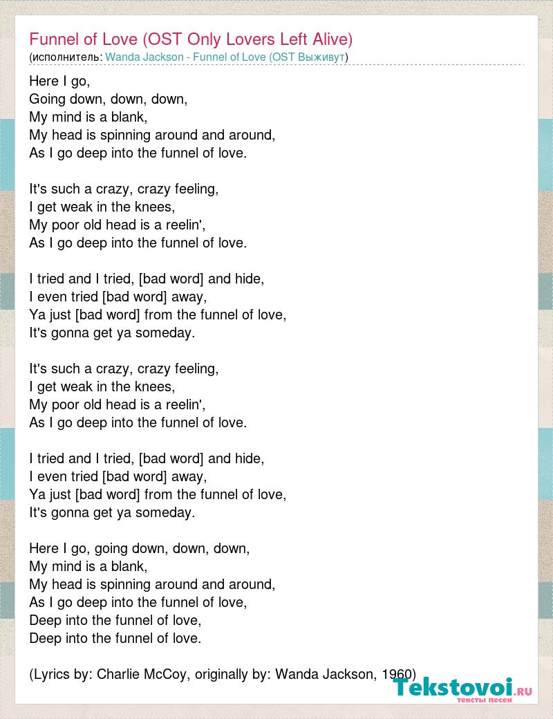 Here I go, Going down, down, down, My mind is a blank, My head is spinning around and around, As I go deep into the funnel of love. It's such a crazy, crazy feeling, I get weak in the knees, My poor old head is a reelin', As I go deep into the funnel of love. I tried and I tried, [bad word] and hide, I even tried [bad word] away, Ya just [bad word] from the funnel of love, It's gonna get ya someday. It's such a crazy, crazy feeling, I get weak in the knees, My poor old head is a reelin', As I go deep into the funnel of love. I tried and I tried, [bad word] and hide, I even tried [bad word] away, Ya just [bad word] from the funnel of love, It's gonna get ya someday. Here I go, going down, down, down, My mind is a blank, My head is spinning around and around, As I go deep into the funnel of love, Deep into the funnel of love, Deep into the funnel of love. (Lyrics by: Charlie McCoy, originally by: Wanda Jackson, 1960)