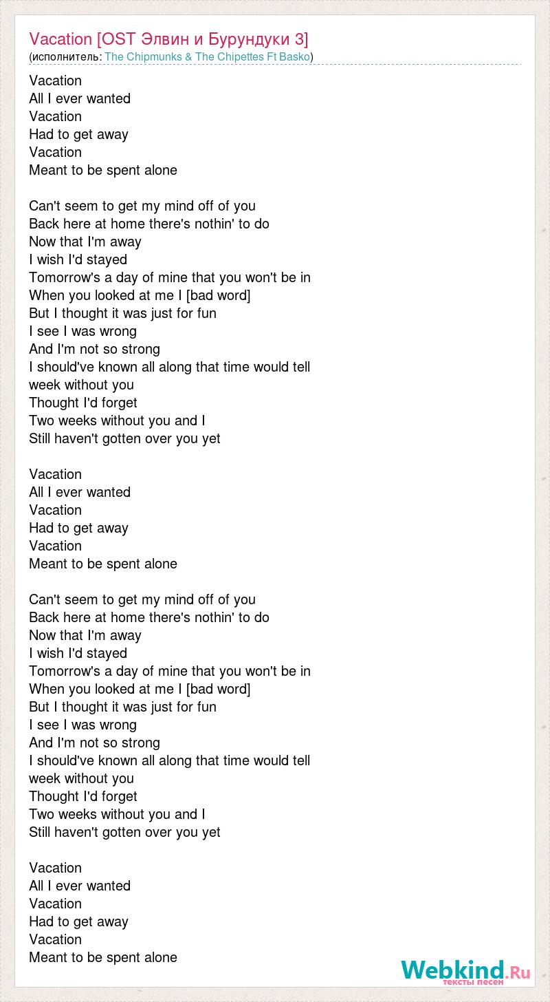 Vacation All I ever wanted Vacation Had to get away Vacation Meant to be spent alone Can't seem to get my mind off of you Back here at home there's nothin' to do Now that I'm away I wish I'd stayed Tomorrow's a day of mine that you won't be in When you looked at me I [bad word] But I thought it was just for fun I see I was wrong And I'm not so strong I should've known all along that time would tell week without you Thought I'd forget Two weeks without you and I Still haven't gotten over you yet Vacation All I ever wanted Vacation Had to get away Vacation Meant to be spent alone Can't seem to get my mind off of you Back here at home there's nothin' to do Now that I'm away I wish I'd stayed Tomorrow's a day of mine that you won't be in When you looked at me I [bad word] But I thought it was just for fun I see I was wrong And I'm not so strong I should've known all along that time would tell week without you Thought I'd forget Two weeks without you and I Still haven't gotten over you yet Vacation All I ever wanted Vacation Had to get away Vacation Meant to be spent alone