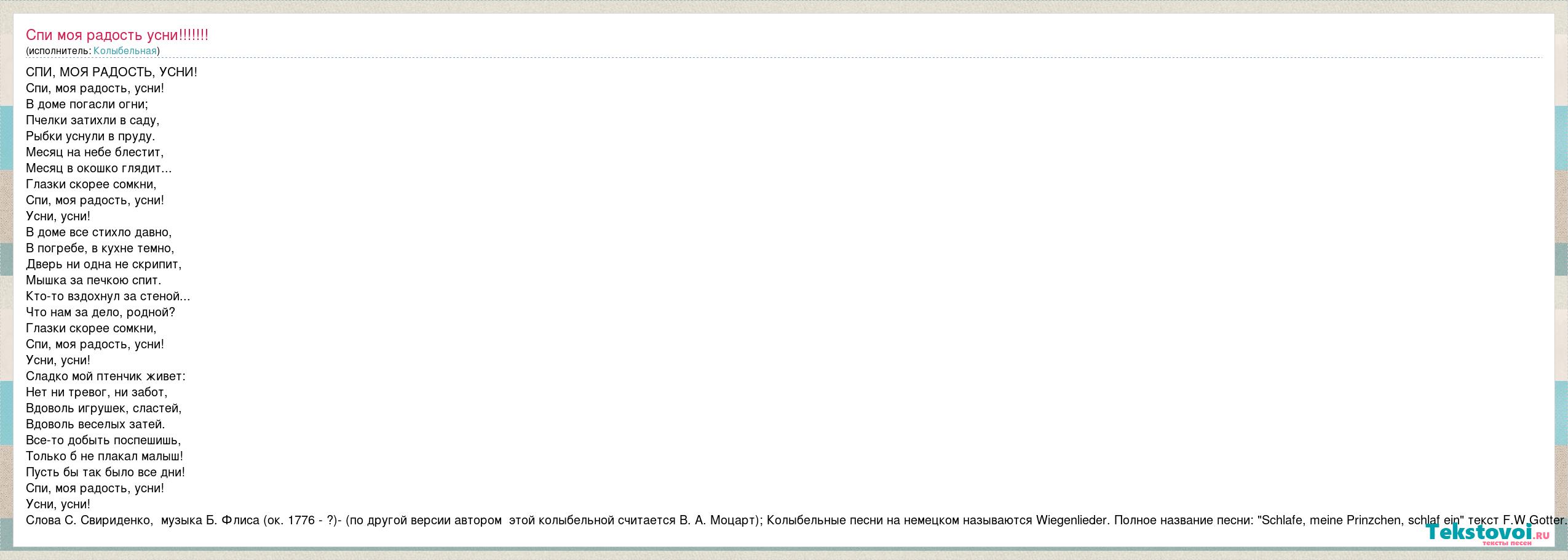 СПИ, МОЯ РАДОСТЬ, УСНИ! Спи, моя радость, усни! В доме погасли огни; Пчелки затихли в саду, Рыбки уснули в пруду. Месяц на небе блестит, Месяц в окошко глядит... Глазки скорее сомкни, Спи, моя радость, усни! Усни, усни! В доме все стихло давно, В погребе, в кухне темно, Дверь ни одна не скрипит, Мышка за печкою спит. Кто-то вздохнул за стеной... Что нам за дело, родной? Глазки скорее сомкни, Спи, моя радость, усни! Усни, усни! Сладко мой птенчик живет: Нет ни тревог, ни забот, Вдоволь игрушек, сластей, Вдоволь веселых затей. Все-то добыть поспешишь, Только б не плакал малыш! Пусть бы так было все дни! Спи, моя радость, усни! Усни, усни! Слова С. Свириденко, музыка Б. Флиса (ок. 1776 - ?)- (по другой версии автором этой колыбельной считается В. А. Моцарт); Колыбельные песни на немецком называются Wiegenlieder. Полное название песни: "Schlafe, meine Рrinzchen, schlaf ein" текст F.W.Gotter.
