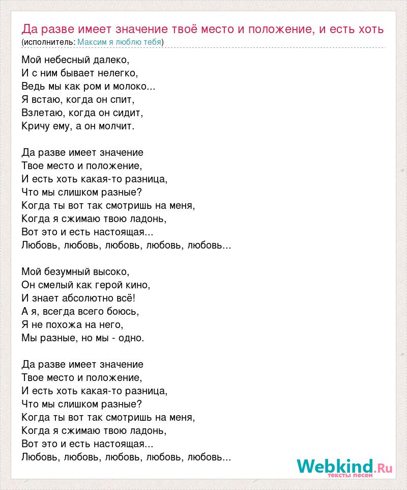 Главная→Исполнители→Максим я люблю тебя→Да разве имеет значение твоё место и положение, и есть хоть какая-то разница, чт