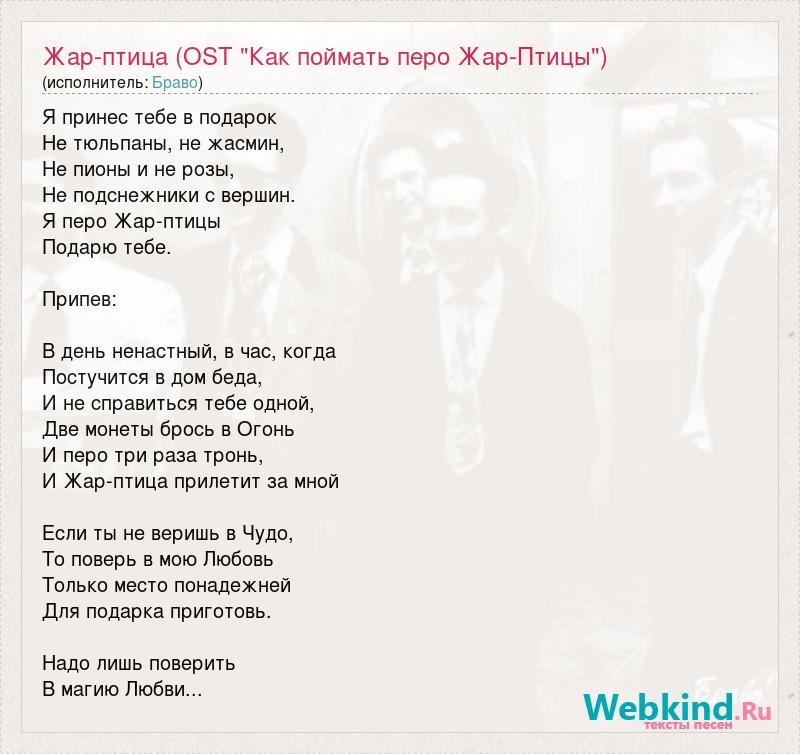 Я принес тебе в подарок Не тюльпаны, не жасмин, Не пионы и не розы, Не подснежники с вершин. Я перо Жар-птицы Подарю тебе. Припев: В день ненастный, в час, когда Постучится в дом беда, И не справиться тебе одной, Две монеты брось в Огонь И перо три раза тронь, И Жар-птица прилетит за мной Если ты не веришь в Чудо, То поверь в мою Любовь Только место понадежней Для подарка приготовь. Надо лишь поверить В магию Любви...