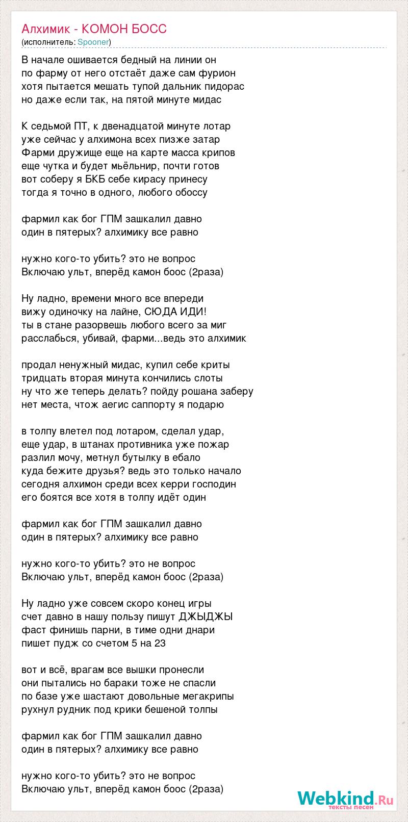 В начале ошивается бедный на линии он по фарму от него отстаёт даже сам фурион хотя пытается мешать тупой дальник пидорас но даже если так, на пятой минуте мидас К седьмой ПТ, к двенадцатой минуте лотар уже сейчас у алхимона всех пизже затар Фарми дружище еще на карте масса крипов еще чутка и будет мьёльнир, почти готов вот соберу я БКБ себе кирасу принесу тогда я точно в одного, любого обоссу фармил как бог ГПМ зашкалил давно один в пятерых? алхимику все равно нужно кого-то убить? это не вопрос Включаю ульт, вперёд камон боос (2раза) Ну ладно, времени много все впереди вижу одиночку на лайне, СЮДА ИДИ! ты в стане разорвешь любого всего за миг расслабься, убивай, фарми...ведь это алхимик продал ненужный мидас, купил себе криты тридцать вторая минута кончились слоты ну что же теперь делать? пойду рошана заберу нет места, чтож аегис саппорту я подарю в толпу влетел под лотаром, сделал удар, еще удар, в штанах противника уже пожар разлил мочу, метнул бутылку в ебало куда бежите друзья? ведь это только начало сегодня алхимон среди всех керри господин его боятся все хотя в толпу идёт один фармил как бог ГПМ зашкалил давно один в пятерых? алхимику все равно нужно кого-то убить? это не вопрос Включаю ульт, вперёд камон боос (2раза) Ну ладно уже совсем скоро конец игры счет давно в нашу пользу пишут ДЖЫДЖЫ фаст финишь парни, в тиме одни днари пишет пудж со счетом 5 на 23 вот и всё, врагам все вышки пронесли они пытались но бараки тоже не спасли по базе уже шастают довольные мегакрипы рухнул рудник под крики бешеной толпы фармил как бог ГПМ зашкалил давно один в пятерых? алхимику все равно нужно кого-то убить? это не вопрос Включаю ульт, вперёд камон боос (2раза)