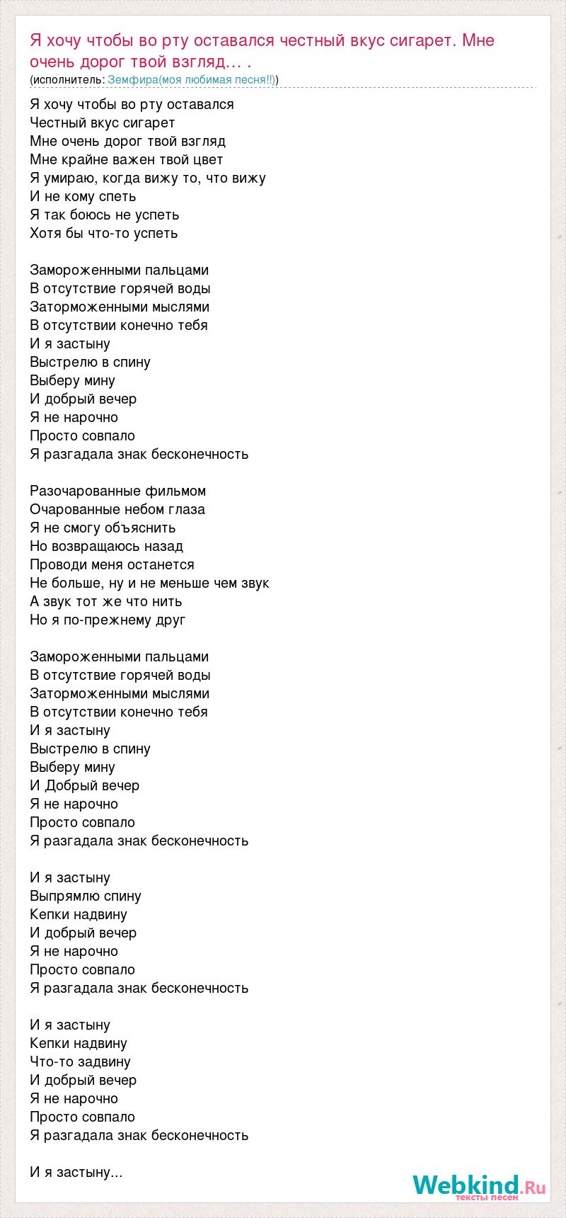 Я хочу чтобы во рту оставался Честный вкус сигарет Мне очень дорог твой взгляд Мне крайне важен твой цвет Я умираю, когда вижу то, что вижу И не кому спеть Я так боюсь не успеть Хотя бы что-то успеть Замороженными пальцами В отсутствие горячей воды Заторможенными мыслями В отсутствии конечно тебя И я застыну Выстрелю в спину Выберу мину И добрый вечер Я не нарочно Просто совпало Я разгадала знак бесконечность Разочарованные фильмом Очарованные небом глаза Я не смогу объяснить Но возвращаюсь назад Проводи меня останется Не больше, ну и не меньше чем звук А звук тот же что нить Но я по-прежнему друг Замороженными пальцами В отсутствие горячей воды Заторможенными мыслями В отсутствии конечно тебя И я застыну Выстрелю в спину Выберу мину И Добрый вечер Я не нарочно Просто совпало Я разгадала знак бесконечность И я застыну Выпрямлю спину Кепки надвину И добрый вечер Я не нарочно Просто совпало Я разгадала знак бесконечность И я застыну Кепки надвину Что-то задвину И добрый вечер Я не нарочно Просто совпало Я разгадала знак бесконечность И я застыну...
