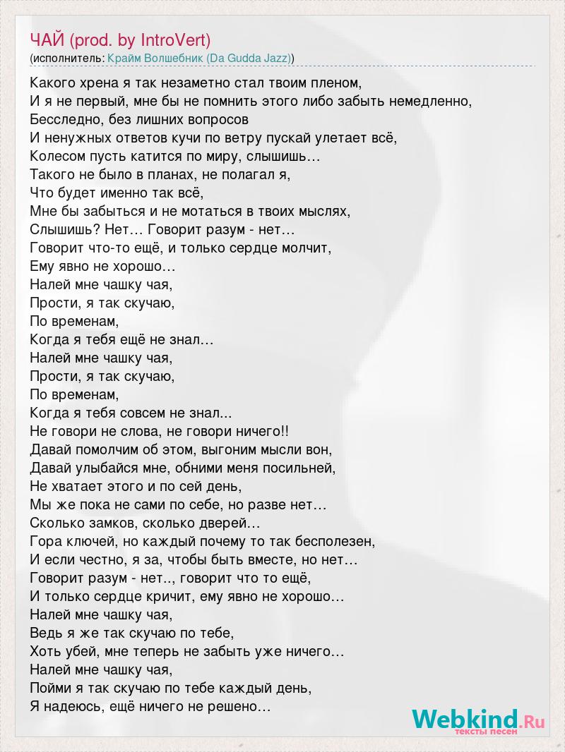 Какого хрена я так незаметно стал твоим пленом, И я не первый, мне бы не помнить этого либо забыть немедленно, Бесследно, без лишних вопросов И ненужных ответов кучи по ветру пускай улетает всё, Колесом пусть катится по миру, слышишь… Такого не было в планах, не полагал я, Что будет именно так всё, Мне бы забыться и не мотаться в твоих мыслях, Слышишь? Нет… Говорит разум - нет… Говорит что-то ещё, и только сердце молчит, Ему явно не хорошо… Налей мне чашку чая, Прости, я так скучаю, По временам, Когда я тебя ещё не знал… Налей мне чашку чая, Прости, я так скучаю, По временам, Когда я тебя совсем не знал... Не говори не слова, не говори ничего!! Давай помолчим об этом, выгоним мысли вон, Давай улыбайся мне, обними меня посильней, Не хватает этого и по сей день, Мы же пока не сами по себе, но разве нет… Сколько замков, сколько дверей… Гора ключей, но каждый почему то так бесполезен, И если честно, я за, чтобы быть вместе, но нет… Говорит разум - нет.., говорит что то ещё, И только сердце кричит, ему явно не хорошо… Налей мне чашку чая, Ведь я же так скучаю по тебе, Хоть убей, мне теперь не забыть уже ничего… Налей мне чашку чая, Пойми я так скучаю по тебе каждый день, Я надеюсь, ещё ничего не решено…