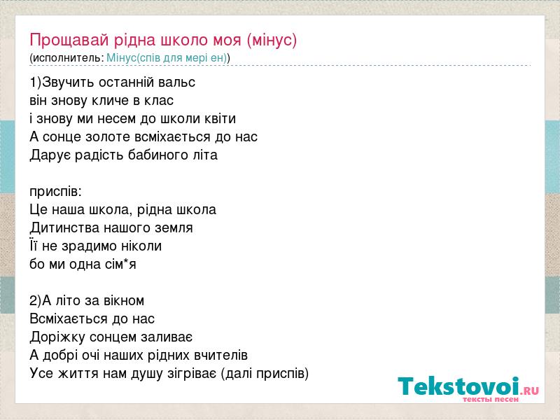 1)Звучить останній вальс він знову кличе в клас і знову ми несем до школи квіти А сонце золоте всміхається до нас Дарує радість бабиного літа приспів: Це наша школа, рідна школа Дитинства нашого земля Її не зрадимо ніколи бо ми одна сім*я 2)А літо за вікном Всміхається до нас Доріжку сонцем заливає А добрі очі наших рідних вчителів Усе життя нам душу зігріває (далі приспів)
