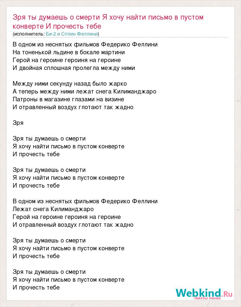 Главная→Исполнители→Би-2 и Сплин Феллини→Зря ты думаешь о смерти Я хочу найти письмо в пустом конверте И прочесть тебе