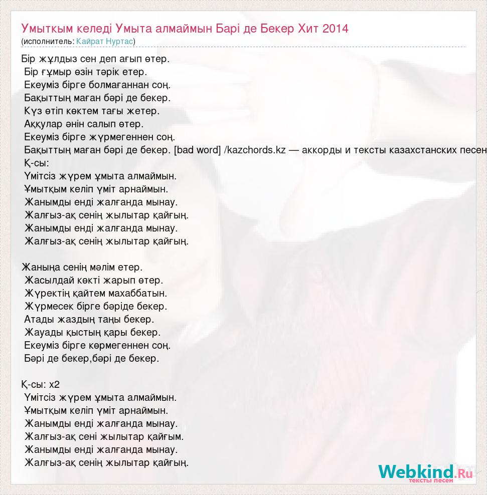 Бір жұлдыз сен деп ағып өтер. Бір ғұмыр өзін тәрік етер. Екеуміз бірге болмағаннан соң. Бақыттың маған бәрі де бекер. Күз өтіп көктем тағы жетер. Аққулар әнін салып өтер. Екеуміз бірге жүрмегеннен соң. Бақыттың маған бәрі де бекер. [bad word] /kazchords.kz — аккорды и тексты казахстанских песен Қ-сы: Үмітсіз жүрем ұмыта алмаймын. Ұмытқым келіп үміт арнаймын. Жанымды енді жалғанда мынау. Жалғыз-ақ сенің жылытар қайғың. Жанымды енді жалғанда мынау. Жалғыз-ақ сенің жылытар қайғың. Жаныңа сенің мәлім етер. Жасылдай көкті жарып өтер. Жүректің қайтем махаббатын. Жүрмесек бірге бәріде бекер. Атады жаздың таңы бекер. Жауады қыстың қары бекер. Екеуміз бірге көрмегеннен соң. Бәрі де бекер,бәрі де бекер. Қ-сы: х2 Үмітсіз жүрем ұмыта алмаймын. Ұмытқым келіп үміт арнаймын. Жанымды енді жалғанда мынау. Жалғыз-ақ сені жылытар қайғым. Жанымды енді жалғанда мынау. Жалғыз-ақ сенің жылытар қайғың.