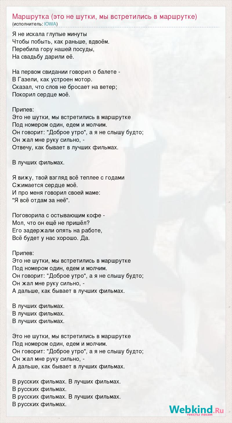 Я не искала глупые минуты Чтобы побыть, как раньше, вдвоём. Перебила гору нашей посуды, На свадьбу дарили её. На первом свидании говорил о балете - В Газели, как устроен мотор. Сказал, что слов не бросает на ветер; Покорил сердце моё. Припев: Это не шутки, мы встретились в маршрутке Под номером один, едем и молчим. Он говорит: "Доброе утро", а я не слышу будто; Он жал мне руку сильно, - Отвечу, как бывает в лучших фильмах. В лучших фильмах. Я вижу, твой взгляд всё теплее с годами Сжимается сердце моё. И про меня говорил своей маме: "Я всё отдам за неё". Поговорила с остывающим кофе - Мол, что он ещё не пришёл? Его задержали опять на работе, Всё будет у нас хорошо. Да. Припев: Это не шутки, мы встретились в маршрутке Под номером один, едем и молчим. Он говорит: "Доброе утро", а я не слышу будто; Он жал мне руку сильно, - А дальше, как бывает в лучших фильмах. В лучших фильмах. В лучших фильмах. В лучших фильмах. Это не шутки, мы встретились в маршрутке Под номером один, едем и молчим. Он говорит: "Доброе утро", а я не слышу будто; Он жал мне руку сильно, - А дальше, как бывает в лучших фильмах. В русских фильмах. В лучших фильмах. В русских фильмах. В русских фильмах. В лучших фильмах. В русских фильмах.