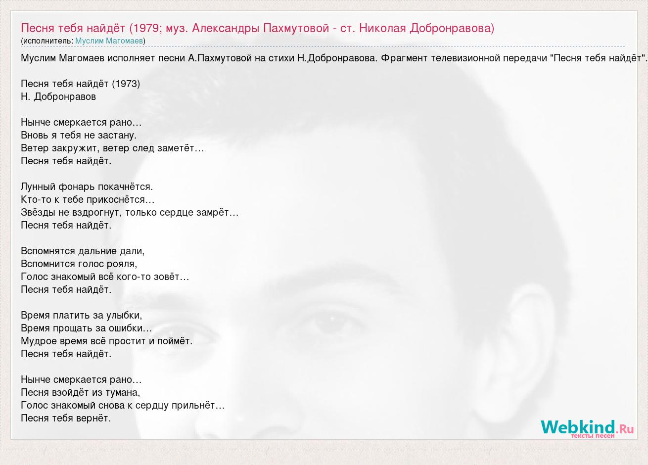 Муслим Магомаев исполняет песни А.Пахмутовой на стихи Н.Добронравова. Фрагмент телевизионной передачи "Песня тебя найдёт". Песня тебя найдёт (1973) Н. Добронравов Нынче смеркается рано… Вновь я тебя не застану. Ветер закружит, ветер след заметёт… Песня тебя найдёт. Лунный фонарь покачнётся. Кто-то к тебе прикоснётся… Звёзды не вздрогнут, только сердце замрёт… Песня тебя найдёт. Вспомнятся дальние дали, Вспомнится голос рояля, Голос знакомый всё кого-то зовёт… Песня тебя найдёт. Время платить за улыбки, Время прощать за ошибки… Мудрое время всё простит и поймёт. Песня тебя найдёт. Нынче смеркается рано… Песня взойдёт из тумана, Голос знакомый снова к сердцу прильнёт… Песня тебя вернёт.