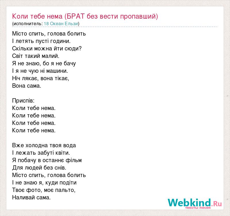 Місто спить, голова болить І летять пусті години. Скільки можна йти сюди? Світ такий малий. Я не знаю, бо я не бачу І я не чую ні машини. Ніч лякає, вона тікає, Вона сама. Приспів: Коли тебе нема. Коли тебе нема. Коли тебе нема. Коли тебе нема. Вже холодна твоя вода І лежать забуті квіти. Я побачу в останнє фільм Для людей без снів. Місто спить, голова болить І не знаю я, куди подіти Твоє фото, моє пальто, Наливай сама.