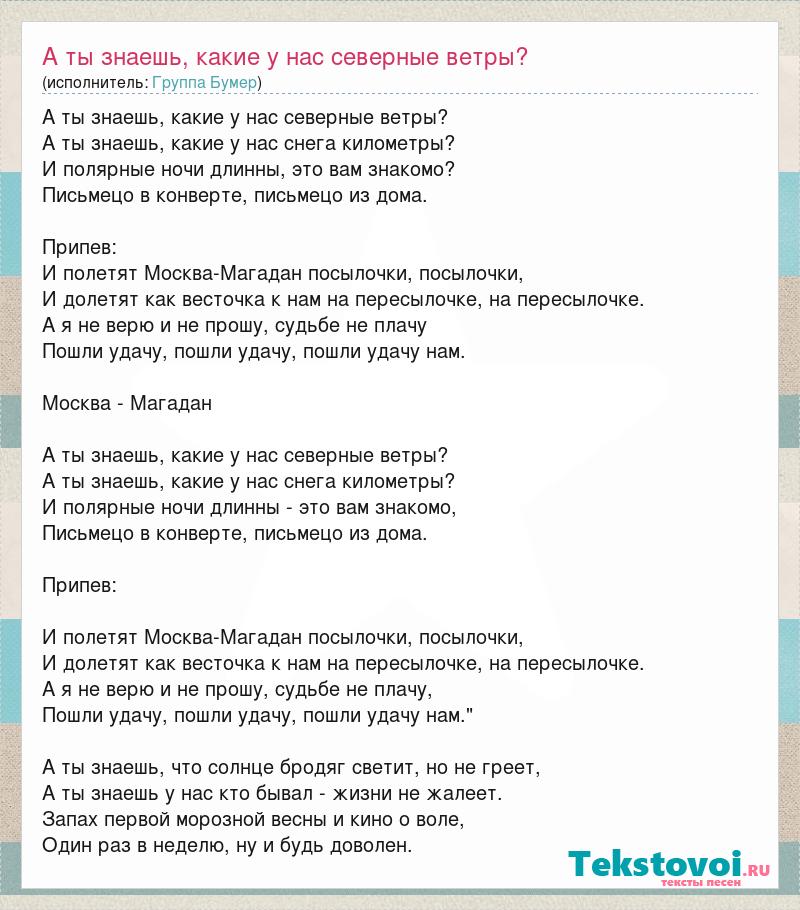 А ты знаешь, какие у нас северные ветры? А ты знаешь, какие у нас снега километры? И полярные ночи длинны, это вам знакомо? Письмецо в конверте, письмецо из домa. Припев: И полетят Москва-Магадан посылочки, посылочки, И долетят как весточка к нам на пересылочке, на пересылочке. А я не верю и не прошу, судьбе не плачу Пошли удачу, пошли удачу, пошли удачу нам. Москва - Магадан А ты знаешь, какие у нас северные ветры? А ты знаешь, какие у нас снега километры? И полярные ночи длинны - это вам знакомо, Письмецо в конверте, письмецо из дома. Припев: И полетят Москва-Магадан посылочки, посылочки, И долетят как весточка к нам на пересылочке, на пересылочке. А я не верю и не прошу, судьбе не плачу, Пошли удачу, пошли удачу, пошли удачу нам." А ты знаешь, что солнце бродяг светит, но не греет, А ты знаешь у нас кто бывал - жизни не жалеет. Запах первой морозной весны и кино о воле, Один раз в неделю, ну и будь доволен.