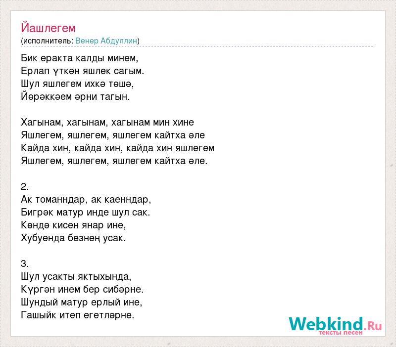 Бик еракта калды минем, Ерлап үткән яшлек сагым. Шул яшлегем ихкә төшә, Йөрәккәем әрни тагын. Хагынам, хагынам, хагынам мин хине Яшлегем, яшлегем, яшлегем кайтха әле Кайда хин, кайда хин, кайда хин яшлегем Яшлегем, яшлегем, яшлегем кайтха әле. 2. Ак томанндар, ак каенндар, Бигрәк матур инде шул сак. Көндә кисен янар ине, Хубуенда безнең усак. 3. Шул усакты яктыхында, Күргән инем бер сибәрне. Шундый матур ерлый ине, Гашыйк итеп егетләрне.
