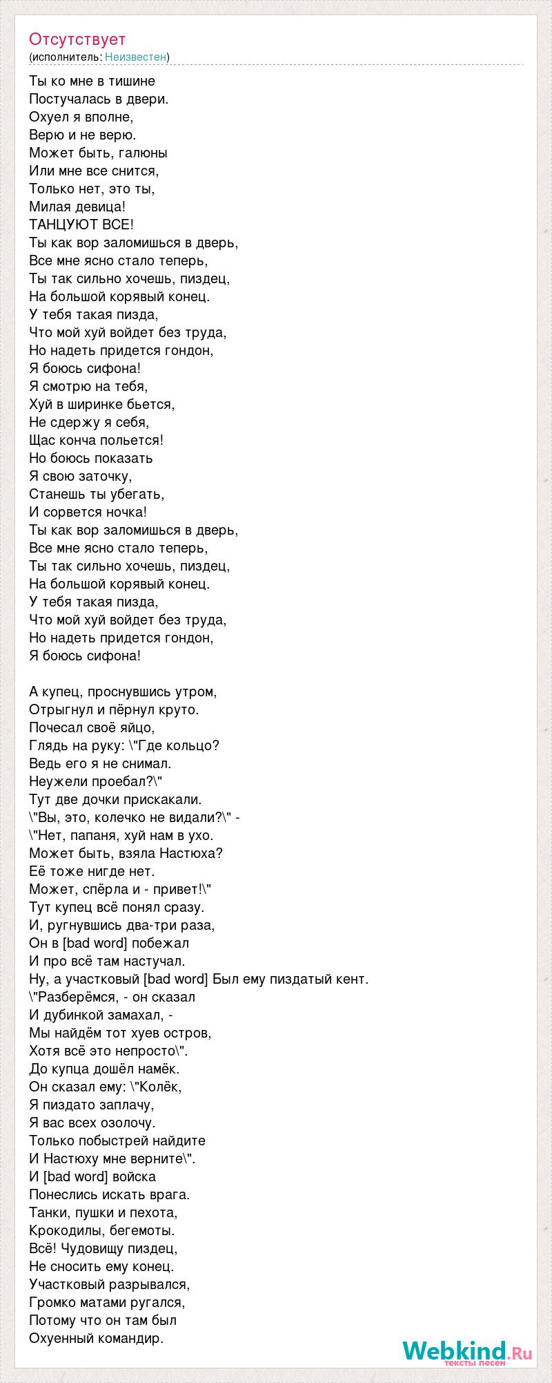 Ты ко мне в тишине Постучалась в двери. Охуел я вполне, Верю и не верю. Может быть, галюны Или мне все снится, Только нет, это ты, Милая девица! ТАНЦУЮТ ВСЕ! Ты как вор заломишься в дверь, Все мне ясно стало теперь, Ты так сильно хочешь, пиздец, На большой корявый конец. У тебя такая пизда, Что мой хуй войдет без труда, Но надеть придется гондон, Я боюсь сифона! Я смотрю на тебя, Хуй в ширинке бьется, Не сдержу я себя, Щас конча польется! Но боюсь показать Я свою заточку, Станешь ты убегать, И сорвется ночка! Ты как вор заломишься в дверь, Все мне ясно стало теперь, Ты так сильно хочешь, пиздец, На большой корявый конец. У тебя такая пизда, Что мой хуй войдет без труда, Но надеть придется гондон, Я боюсь сифона! А купец, проснувшись утром, Отрыгнул и пёрнул круто. Почесал своё яйцо, Глядь на руку: \"Где кольцо? Ведь его я не снимал. Неужели проебал?\" Тут две дочки прискакали. \"Вы, это, колечко не видали?\" - \"Нет, папаня, хуй нам в ухо. Может быть, взяла Настюха? Её тоже нигде нет. Может, спёрла и - привет!\" Тут купец всё понял сразу. И, ругнувшись два-три раза, Он в [bad word] побежал И про всё там настучал. Ну, а участковый [bad word] Был ему пиздатый кент. \"Разберёмся, - он сказал И дубинкой замахал, - Мы найдём тот хуев остров, Хотя всё это непросто\". До купца дошёл намёк. Он сказал ему: \"Колёк, Я пиздато заплачу, Я вас всех озолочу. Только побыстрей найдите И Настюху мне верните\". И [bad word] войска Понеслись искать врага. Танки, пушки и пехота, Крокодилы, бегемоты. Всё! Чудовищу пиздец, Не сносить ему конец. Участковый разрывался, Громко матами ругался, Потому что он там был Охуенный командир.