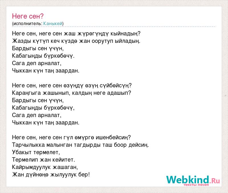 Неге сен, неге сен жаш жүрөгүңдү кыйнадың? Жазды күтүп кеч күздө жан оорутуп ыйладың. Бардыгы сен үчүн, Кабагыңды бүркөбөчү. Сага деп арналат, Чыккан күн таң заардан. Неге сен, неге сен өзүңдү өзүң сүйбөйсүң? Караңгыга жашынып, калдың неге адашып? Бардыгы сен үчүн, Кабагыңды бүркөбөчү, Сага деп арналат, Чыккан күн таң заардан. Неге сен, неге сен гүл өмүргө ишенбейсиң? Тарчылыкка малынган тагдырды таш боор дейсиң. Убакыт термелет, Термелип жан кейитет. Кайрымдуулук жашаган, Жан дүйнөңө жылуулук бер!