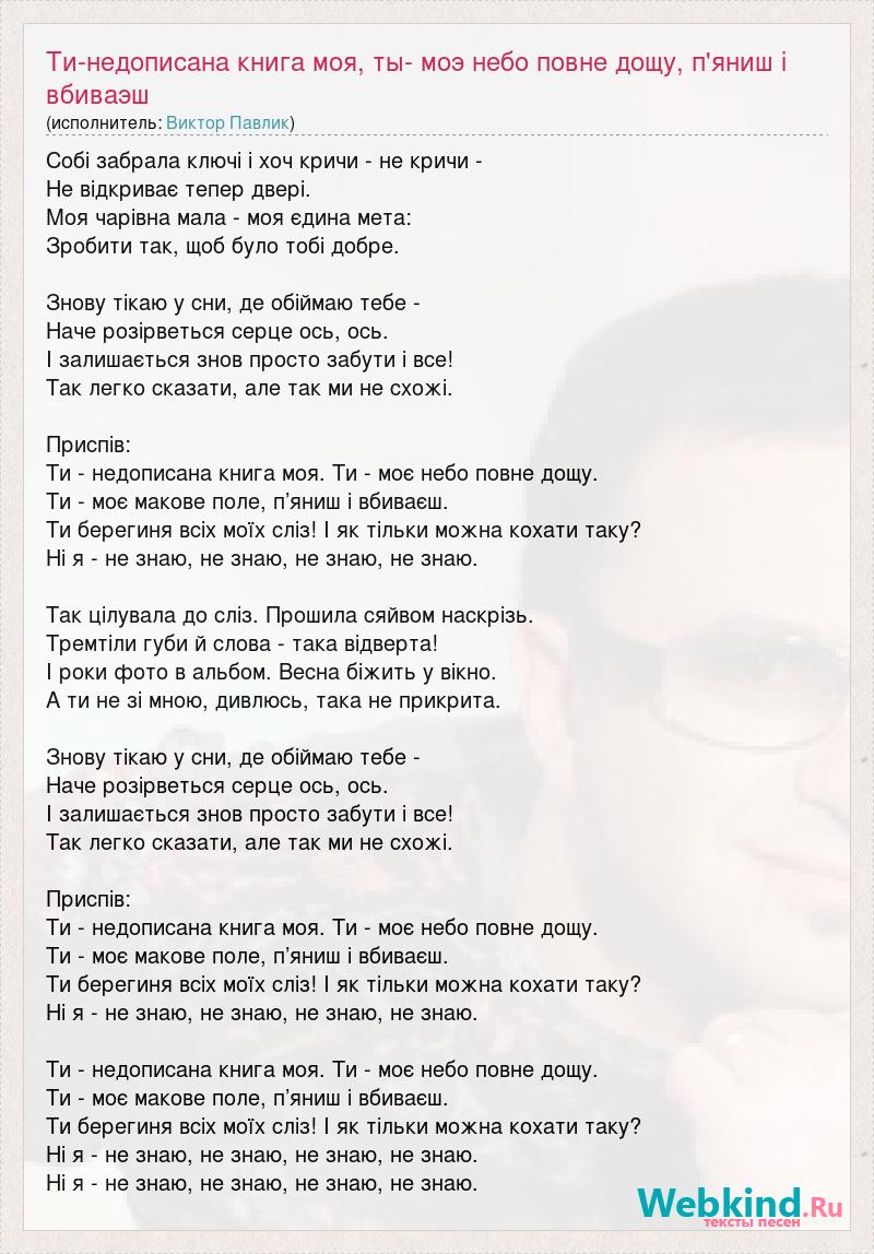 Собі забрала ключі i хоч кричи - не кричи - Не відкриває тепер дверi. Моя чарівна мала - моя єдина мета: Зробити так, щоб було тобі добре. Знову тікаю у сни, де обіймаю тебе - Наче розірветься серце ось, ось. І залишається знов просто забути і все! Так легко сказати, але так ми не схожі. Приспiв: Ти - недописана книга моя. Ти - моє небо повне дощу. Ти - моє макове поле, п’яниш і вбиваєш. Ти берегиня всіх моїх сліз! І як тільки можна кохати таку? Ні я - не знаю, не знаю, не знаю, не знаю. Так цілувала до сліз. Прошила сяйвом наскрізь. Тремтіли губи й слова - така відверта! I роки фото в альбом. Весна біжить у вікно. А ти не зі мною, дивлюсь, така не прикрита. Знову тікаю у сни, де обіймаю тебе - Наче розірветься серце ось, ось. І залишається знов просто забути і все! Так легко сказати, але так ми не схожі. Приспiв: Ти - недописана книга моя. Ти - моє небо повне дощу. Ти - моє макове поле, п’яниш і вбиваєш. Ти берегиня всіх моїх сліз! І як тільки можна кохати таку? Ні я - не знаю, не знаю, не знаю, не знаю. Ти - недописана книга моя. Ти - моє небо повне дощу. Ти - моє макове поле, п’яниш і вбиваєш. Ти берегиня всіх моїх сліз! І як тільки можна кохати таку? Ні я - не знаю, не знаю, не знаю, не знаю. Ні я - не знаю, не знаю, не знаю, не знаю.