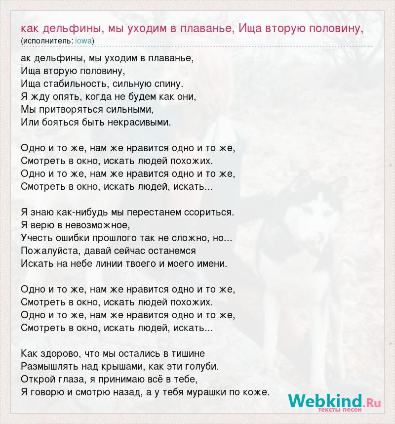 ак дельфины, мы уходим в плаванье, Ища вторую половину, Ища стабильность, сильную спину. Я жду опять, когда не будем как они, Мы притворяться сильными, Или бояться быть некрасивыми. Одно и то же, нам же нравится одно и то же, Смотреть в окно, искать людей похожих. Одно и то же, нам же нравится одно и то же, Смотреть в окно, искать людей, искать... Я знаю как-нибудь мы перестанем ссориться. Я верю в невозможное, Учесть ошибки прошлого так не сложно, но... Пожалуйста, давай сейчас останемся Искать на небе линии твоего и моего имени. Одно и то же, нам же нравится одно и то же, Смотреть в окно, искать людей похожих. Одно и то же, нам же нравится одно и то же, Смотреть в окно, искать людей, искать... Как здорово, что мы остались в тишине Размышлять над крышами, как эти голуби. Открой глаза, я принимаю всё в тебе, Я говорю и смотрю назад, а у тебя мурашки по коже.