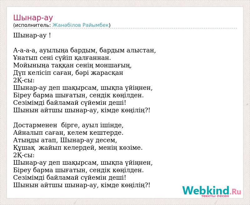 Шынар-ау ! А-а-а-а, ауылыңа бардым, бардым алыстан, Ұнатып сені сүйіп қалғаннан. Мойыныңа таққан сенің моншағың, Дүп келісіп саған, бәрі жарасқан 2Қ-сы: Шынар-ау деп шақырсам, шықпа үйіңнен, Біреу барма шығатын, сендік көңілден. Сезімімді байламай сүйемін деші! Шынын айтшы шынар-ау, кімде көңілің?! Достарменен бірге, ауыл ішінде, Айналып саған, келем кештерде. Атыңды атап, Шынар-ау десем, Құшақ жайып келердей, менің көзіме. 2Қ-сы: Шынар-ау деп шақырсам, шықпа үйіңнен, Біреу барма шығатын, сендік көңілден. Сезімімді байламай сүйемін деші! Шынын айтшы шынар-ау, кімде көңілің?!