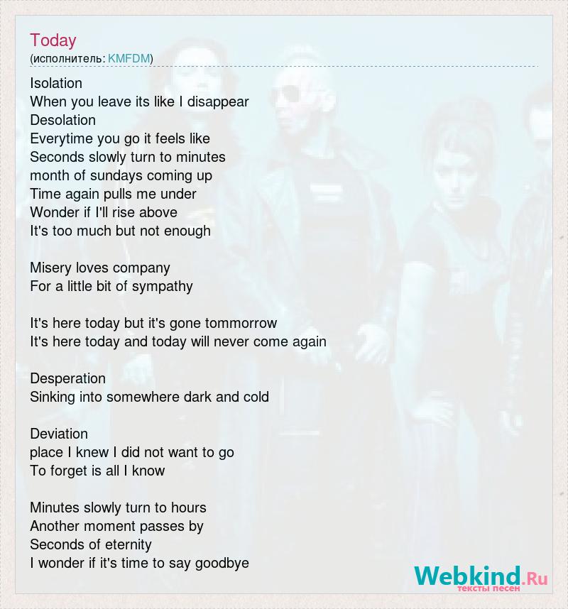 Isolation When you leave its like I disappear Desolation Everytime you go it feels like Seconds slowly turn to minutes month of sundays coming up Time again pulls me under Wonder if I'll rise above It's too much but not enough Misery loves company For a little bit of sympathy It's here today but it's gone tommorrow It's here today and today will never come again Desperation Sinking into somewhere dark and cold Deviation place I knew I did not want to go To forget is all I know Minutes slowly turn to hours Another moment passes by Seconds of eternity I wonder if it's time to say goodbye