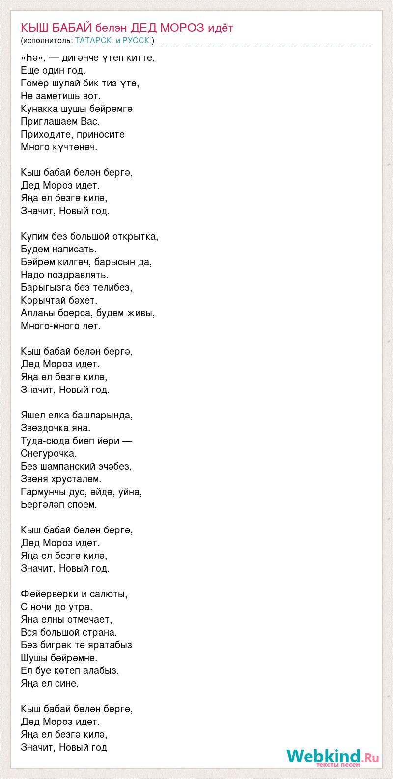 «Һә», — дигәнче үтеп китте, Еще один год. Гомер шулай бик тиз үтә, Не заметишь вот. Кунакка шушы бәйрәмгә Приглашаем Вас. Приходите, приносите Много күчтәнәч. Кыш бабай белән бергә, Дед Мороз идет. Яңа ел безгә килә, Значит, Новый год. Купим без большой открытка, Будем написать. Бәйрәм килгәч, барысын да, Надо поздравлять. Барыгызга без телибез, Корычтай бәхет. Аллаһы боерса, будем живы, Много-много лет. Кыш бабай белән бергә, Дед Мороз идет. Яңа ел безгә килә, Значит, Новый год. Яшел елка башларында, Звездочка яна. Туда-сюда биеп йөри — Снегурочка. Без шампанский эчәбез, Звеня хрусталем. Гармунчы дус, әйдә, уйна, Бергәләп споем. Кыш бабай белән бергә, Дед Мороз идет. Яңа ел безгә килә, Значит, Новый год. Фейерверки и салюты, С ночи до утра. Яна елны отмечает, Вся большой страна. Без бигрәк тә яратабыз Шушы бәйрәмне. Ел буе көтеп алабыз, Яңа ел сине. Кыш бабай белән бергә, Дед Мороз идет. Яңа ел безгә килә, Значит, Новый год