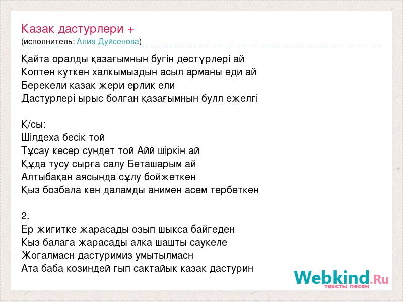Қайта оралды қазағымнын бугін дәстүрлері ай Коптен куткен халкымыздын асыл арманы еди ай Берекели казак жери ерлик ели Дастурлері ырыс болган қазағымнын булл ежелгі Қ/сы: Шілдеха бесік той Тұсау кесер сундет той Айй шіркін ай Құда тусу сырға салу Беташарым ай Алтыбақан аясында сұлу бойжеткен Қыз бозбала кен даламды анимен асем тербеткен 2. Ер жигитке жарасады озып шыкса байгеден Кыз балага жарасады алка шашты саукеле Жогалмасн дастуримиз умытылмасн Ата баба козиндей гып сактайык казак дастурин