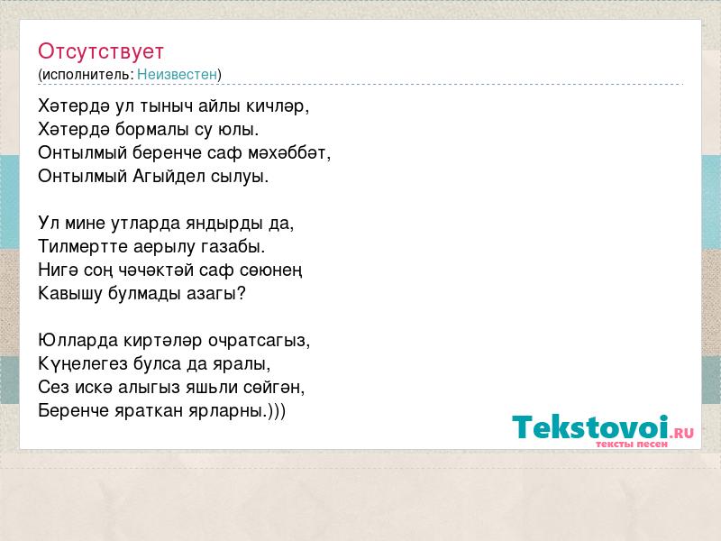 Хәтердә ул тыныч айлы кичләр, Хәтердә бормалы су юлы. Онтылмый беренче саф мәхәббәт, Онтылмый Агыйдел сылуы. Ул мине утларда яндырды да, Тилмертте аерылу газабы. Нигә соң чәчәктәй саф сөюнең Кавышу булмады азагы? Юлларда киртәләр очратсагыз, Күңелегез булса да яралы, Сез искә алыгыз яшьли сөйгән, Беренче яраткан ярларны.)))