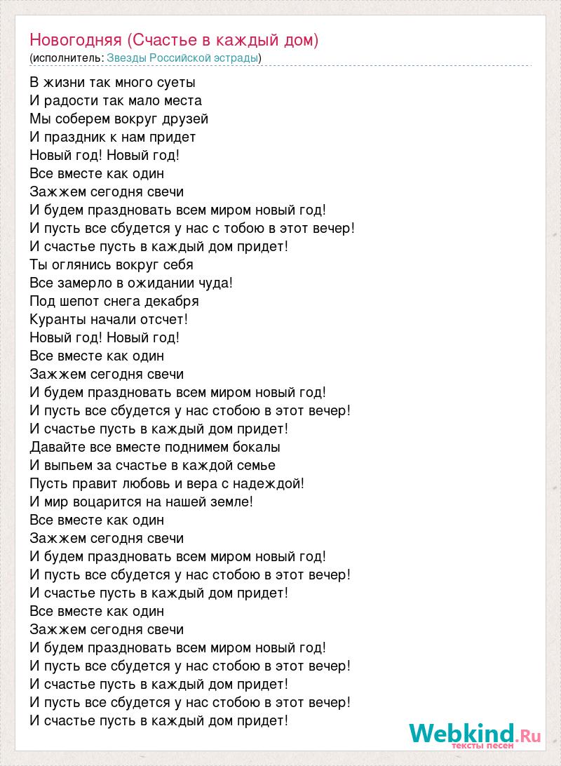 В жизни так много суеты И радости так мало места Мы соберем вокруг друзей И праздник к нам придет Новый год! Новый год! Все вместе как один Зажжем сегодня свечи И будем праздновать всем миром новый год! И пусть все сбудется у нас с тобою в этот вечер! И счастье пусть в каждый дом придет! Ты оглянись вокруг себя Все замерло в ожидании чуда! Под шепот снега декабря Куранты начали отсчет! Новый год! Новый год! Все вместе как один Зажжем сегодня свечи И будем праздновать всем миром новый год! И пусть все сбудется у нас стобою в этот вечер! И счастье пусть в каждый дом придет! Давайте все вместе поднимем бокалы И выпьем за счастье в каждой семье Пусть правит любовь и вера с надеждой! И мир воцарится на нашей земле! Все вместе как один Зажжем сегодня свечи И будем праздновать всем миром новый год! И пусть все сбудется у нас стобою в этот вечер! И счастье пусть в каждый дом придет! Все вместе как один Зажжем сегодня свечи И будем праздновать всем миром новый год! И пусть все сбудется у нас стобою в этот вечер! И счастье пусть в каждый дом придет! И пусть все сбудется у нас стобою в этот вечер! И счастье пусть в каждый дом придет!