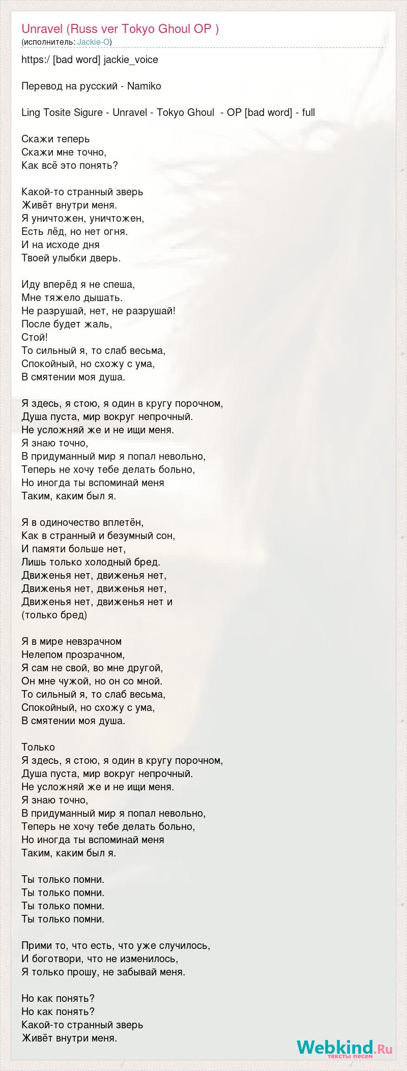 https:/ [bad word] jackie_voice Перевод на русский - Namiko Ling Tosite Sigure - Unravel - Tokyo Ghoul - OP [bad word] - full Скажи теперь Скажи мне точно, Как всё это понять? Какой-то странный зверь Живёт внутри меня. Я уничтожен, уничтожен, Есть лёд, но нет огня. И на исходе дня Твоей улыбки дверь. Иду вперёд я не спеша, Мне тяжело дышать. Не разрушай, нет, не разрушай! После будет жаль, Стой! То сильный я, то слаб весьма, Спокойный, но схожу с ума, В смятении моя душа. Я здесь, я стою, я один в кругу порочном, Душа пуста, мир вокруг непрочный. Не усложняй же и не ищи меня. Я знаю точно, В придуманный мир я попал невольно, Теперь не хочу тебе делать больно, Но иногда ты вспоминай меня Таким, каким был я. Я в одиночество вплетён, Как в странный и безумный сон, И памяти больше нет, Лишь только холодный бред. Движенья нет, движенья нет, Движенья нет, движенья нет, Движенья нет, движенья нет и (только бред) Я в мире невзрачном Нелепом прозрачном, Я сам не свой, во мне другой, Он мне чужой, но он со мной. То сильный я, то слаб весьма, Спокойный, но схожу с ума, В смятении моя душа. Только Я здесь, я стою, я один в кругу порочном, Душа пуста, мир вокруг непрочный. Не усложняй же и не ищи меня. Я знаю точно, В придуманный мир я попал невольно, Теперь не хочу тебе делать больно, Но иногда ты вспоминай меня Таким, каким был я. Ты только помни. Ты только помни. Ты только помни. Ты только помни. Прими то, что есть, что уже случилось, И боготвори, что не изменилось, Я только прошу, не забывай меня. Но как понять? Но как понять? Какой-то странный зверь Живёт внутри меня.