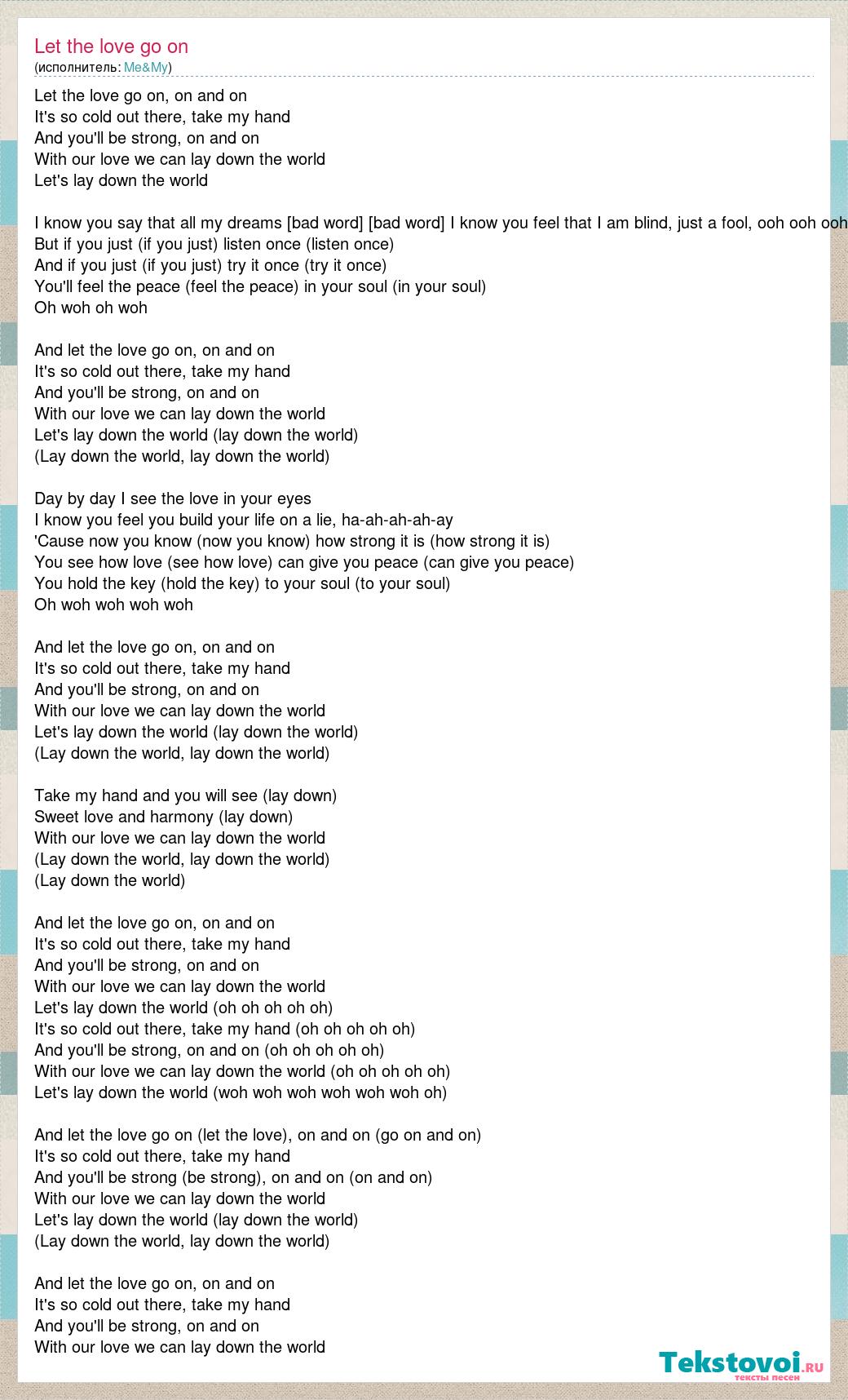Let the love go on, on and on It's so cold out there, take my hand And you'll be strong, on and on With our love we can lay down the world Let's lay down the world I know you say that all my dreams won't come true I know you feel that I am blind, just a fool, ooh ooh ooh But if you just (if you just) listen once (listen once) And if you just (if you just) try it once (try it once) You'll feel the peace (feel the peace) in your soul (in your soul) Oh woh oh woh And let the love go on, on and on It's so cold out there, take my hand And you'll be strong, on and on With our love we can lay down the world Let's lay down the world (lay down the world) (Lay down the world, lay down the world) Day by day I see the love in your eyes I know you feel you build your life on a lie, ha-ah-ah-ah-ay 'Cause now you know (now you know) how strong it is (how strong it is) You see how love (see how love) can give you peace (can give you peace) You hold the key (hold the key) to your soul (to your soul) Oh woh woh woh woh And let the love go on, on and on It's so cold out there, take my hand And you'll be strong, on and on With our love we can lay down the world Let's lay down the world (lay down the world) (Lay down the world, lay down the world) Take my hand and you will see (lay down) Sweet love and harmony (lay down) With our love we can lay down the world (Lay down the world, lay down the world) (Lay down the world) And let the love go on, on and on It's so cold out there, take my hand And you'll be strong, on and on With our love we can lay down the world Let's lay down the world (oh oh oh oh oh) It's so cold out there, take my hand (oh oh oh oh oh) And you'll be strong, on and on (oh oh oh oh oh) With our love we can lay down the world (oh oh oh oh oh) Let's lay down the world (woh woh woh woh woh woh oh) And let the love go on (let the love), on and on (go on and on) It's so cold out there, take my hand And you'll be strong (be strong), on and on (on and on) With our love we can lay down the world Let's lay down the world (lay down the world) (Lay down the world, lay down the world) And let the love go on, on and on It's so cold out there, take my hand And you'll be strong, on and on With our love we can lay down the world