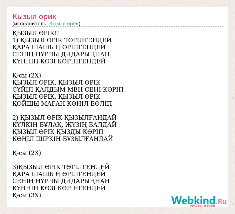 ҚЫЗЫЛ ӨРІК!! 1) ҚЫЗЫЛ ӨРІК ТӨГІЛГЕНДЕЙ ҚАРА ШАШЫҢ ӨРІЛГЕНДЕЙ СЕНІҢ НҰРЛЫ ДИДАРЫҢНАН КҮННІҢ КӨЗІ КӨРІНГЕНДЕЙ Қ-сы (2Х) ҚЫЗЫЛ ӨРІК, ҚЫЗЫЛ ӨРІК СҮЙIП ҚАЛДЫМ МЕН СЕНI КӨРIП ҚЫЗЫЛ ӨРІК, ҚЫЗЫЛ ӨРІК ҚОЙШЫ МАҒАН КӨҢІЛ БӨЛІП 2) ҚЫЗЫЛ ӨРІК ҚЫЗЫЛҒАНДАЙ КҮЛКІҢ БҰЛАҚ, ЖҮЗІҢ БАЛДАЙ ҚЫЗЫЛ ӨРІК ҚЫЗДЫ КӨРІП КӨҢІЛ ШІРКІН БҰЗЫЛҒАНДАЙ Қ-сы (2Х) 3)ҚЫЗЫЛ ӨРІК ТӨГІЛГЕНДЕЙ ҚАРА ШАШЫҢ ӨРІЛГЕНДЕЙ СЕНІҢ НҰРЛЫ ДИДАРЫҢНАН КҮННІҢ КӨЗІ КӨРІНГЕНДЕЙ Қ-сы (3Х)