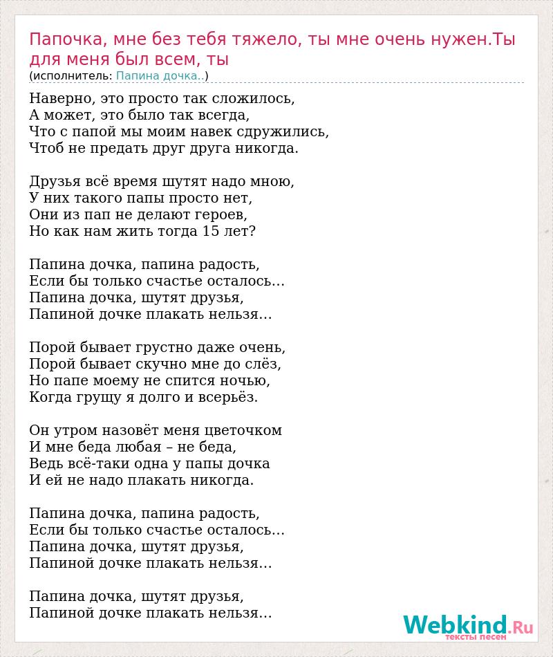 Наверно, это просто так сложилось, А может, это было так всегда, Что с папой мы моим навек сдружились, Чтоб не предать друг друга никогда. Друзья всё время шутят надо мною, У них такого папы просто нет, Они из пап не делают героев, Но как нам жить тогда 15 лет? Папина дочка, папина радость, Если бы только счастье осталось… Папина дочка, шутят друзья, Папиной дочке плакать нельзя… Порой бывает грустно даже очень, Порой бывает скучно мне до слёз, Но папе моему не спится ночью, Когда грущу я долго и всерьёз. Он утром назовёт меня цветочком И мне беда любая – не беда, Ведь всё-таки одна у папы дочка И ей не надо плакать никогда. Папина дочка, папина радость, Если бы только счастье осталось… Папина дочка, шутят друзья, Папиной дочке плакать нельзя… Папина дочка, шутят друзья, Папиной дочке плакать нельзя…