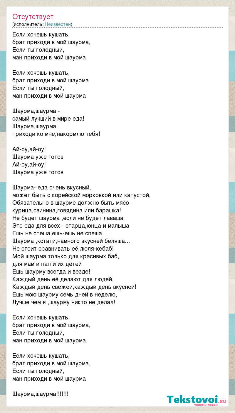 Если хочешь кушать, брат приходи в мой шаурма, Если ты голодный, ман приходи в мой шаурма Если хочешь кушать, брат приходи в мой шаурма Если ты голодный, ман приходи в мой шаурма Шаурма,шаурма - самый лучший в мире еда! Шаурма,шаурма приходи ко мне,накормлю тебя! Ай-оу,ай-оу! Шаурма уже готов Ай-оу,ай-оу! Шаурма уже готов Шаурма- еда очень вкусный, может быть с корейской морковкой или капустой, Обязательно в шаурме должно быть мясо - курица,свинина,говядина или барашка! Не будет шаурма ,если не будет лаваша Это еда для всех - старца,юнца и малыша Ешь не спеша,ешь-ешь не спеша, Шаурма ,кстати,намного вкусней беляша... Не стоит сравнивать её люля-кебаб! Мой шаурма только для красивых баб, для мам и пап и их детей Ешь шаурму всегда и везде! Каждый день её делают для людей, Каждый день свежей,каждый день вкусней! Ешь мою шаурму семь дней в неделю, Лучше чем я ,шаурму никто не делал! Если хочешь кушать, брат приходи в мой шаурма, Если ты голодный, ман приходи в мой шаурма Если хочешь кушать, брат приходи в мой шаурма, Если ты голодный, ман приходи в мой шаурма Шаурма,шаурма!!!!!!!